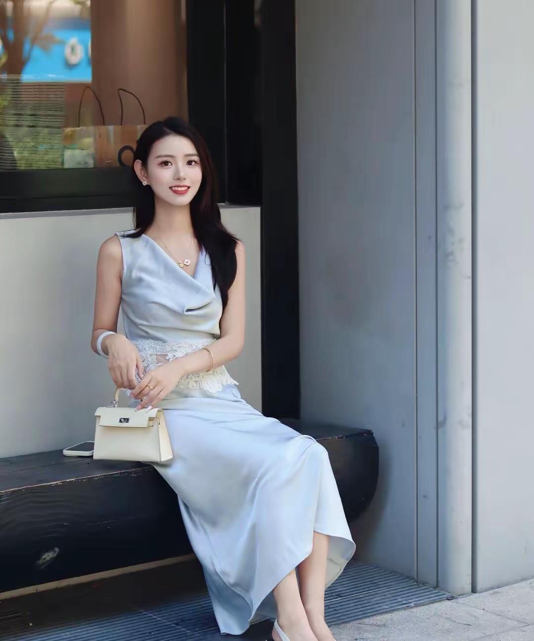优雅气质,浅蓝色连衣裙搭配白色高跟鞋,完美展现都市女性的时尚魅力。