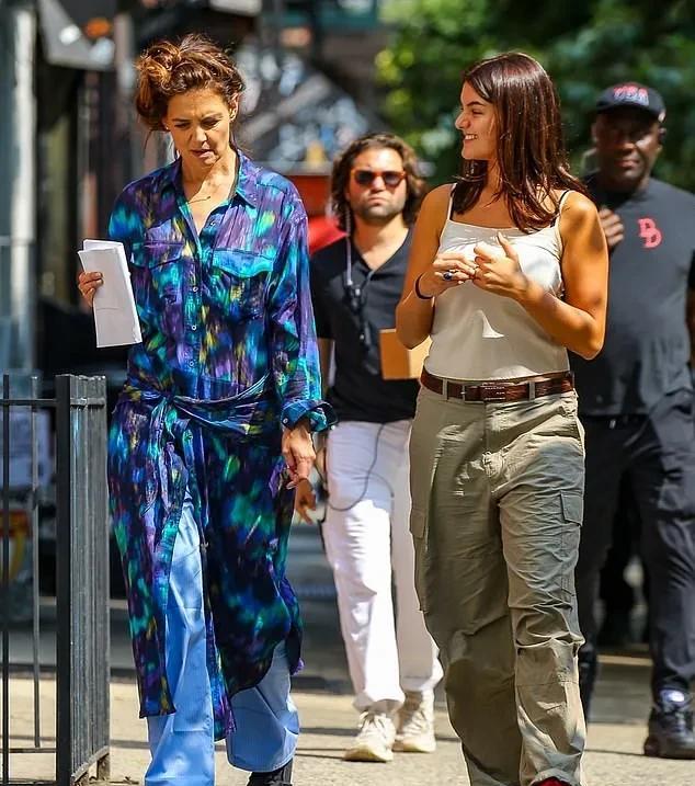 19岁的苏瑞·克鲁斯在纽约探班,她的妈妈凯蒂·赫尔姆斯正在拍电影《欢乐时光》。 阿汤哥女儿身着吊带衫和休闲工装裤,脚踩红色运动鞋与母亲在片场边走边聊。