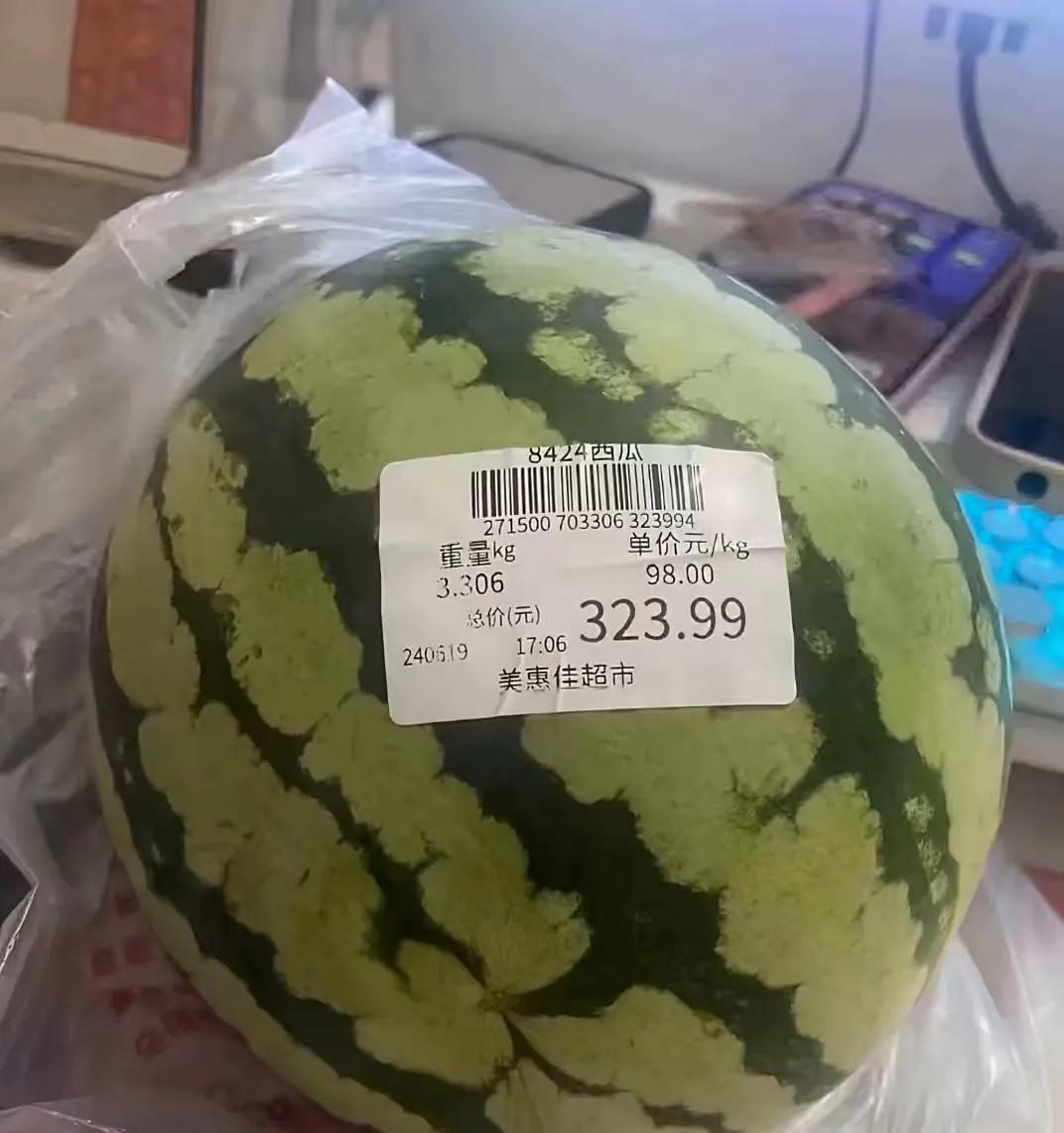 一个西瓜323.99元,天呐,这是什么西瓜?这是金子做的? 8424的西瓜,这么贵吗?98块钱一公斤,3.3公斤的西瓜价格324元。 这西瓜谁吃的起? 这不是在日本,韩国,这是在中国。我们都实现西瓜自由了,居然还有西瓜卖到300多一个。 难道这西瓜,吃了能美容养颜? 有补肾壮阳的功效?