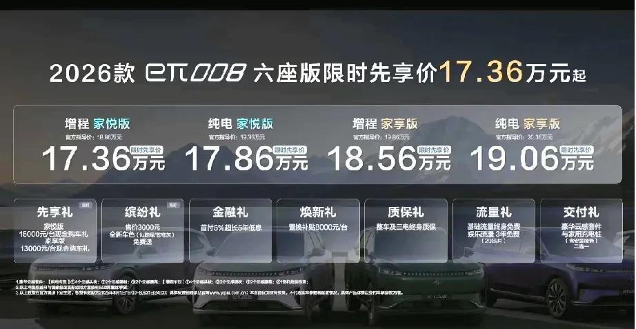 2025,买SUV这样买: 60万——问界M9。 50万——理想L9。 40万——腾势N9。 30万——昊铂HL。 20万——eπ008。 10万——纳米06。 #26款eπ008六座版上市# 东风eπ008是东风汽车2026重磅推出的六座SUV。以“用户为中心,以科技为核心”的主张,全力诠释“舒心品质,舒心科技,舒心驾控和舒心守护”四大维度,回馈百万用户热爱,派送无限精彩。 东风eπ008车身尺寸为:5002/1972/1732mm,轴距3025mm。有纯电和增程两种版本。 东风eπ008纯电综合续航620km。采用热效率高达45.18%高品质马赫电驱。 增程版搭载1.5T涡轮增压器,功率为272PS的后置电机。综合续航超过1200km。CLTC续航202km。同级最低能耗15.1kwh/100km。 支持3c快充,15分钟可将电量从30%充至80%。 东风eπ008底盘为前麦弗逊独立悬架加后多连杆式独立悬架,由三连冠团队底盘精心调校,转向稳、超速快、驾控舒适。 东风eπ008采用高通sa8295P芯片。搭载SOA天元智舱,基于东风全栈自研的“太极大模型”+20项辅助驾驶功能。 整车32个多维感知元件,5个毫米波,6个智能驾驶摄像头。4个环视摄像头,12个超声雷达,3个车内摄像头,1个智能驾控控制器,1个高精度定位单元,为安全出行保驾护航。 东风eπ008车身高强度钢占比70.8%,热成型钢重量占比19.1%,关键成员舱区域高强度钢板达到1500mpa。整车配备6气囊,贯穿式侧气帘,360°全方位守护安全。 东风eπ008价格17.36万元起,8月1日至8月31日,整车及三电终身质保,有8000元购置补贴,至高15000元先享礼和3000元车漆免费赠送。