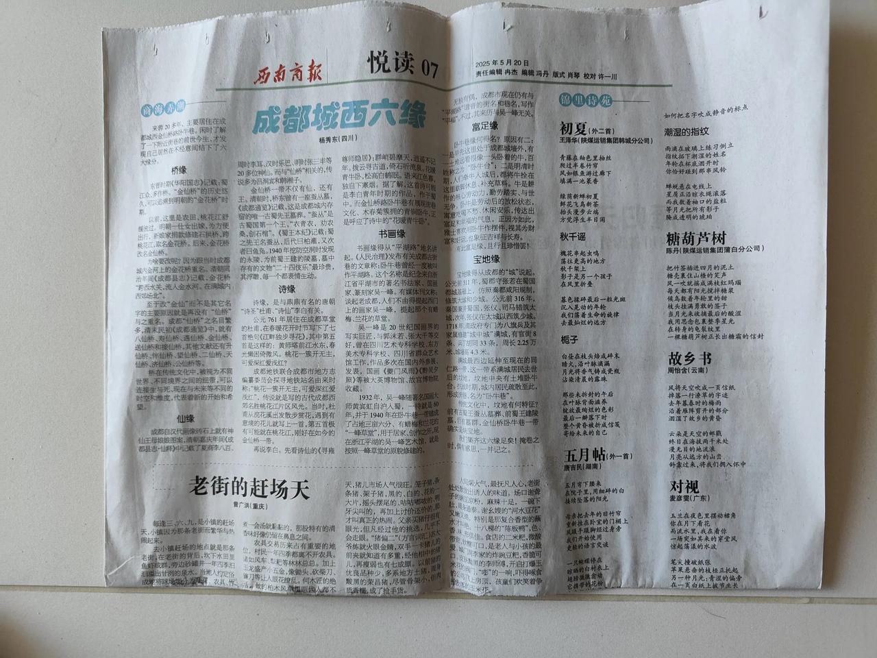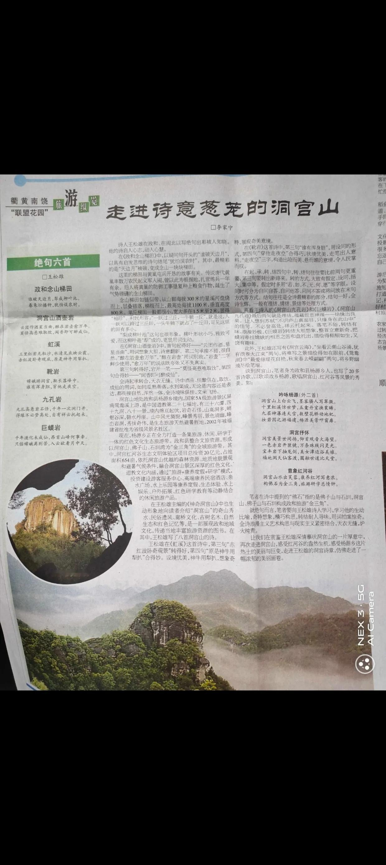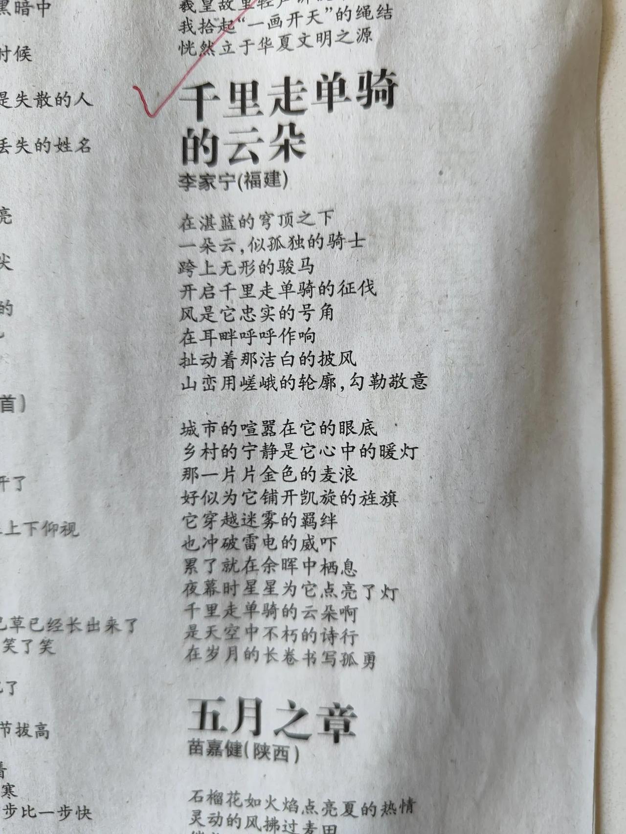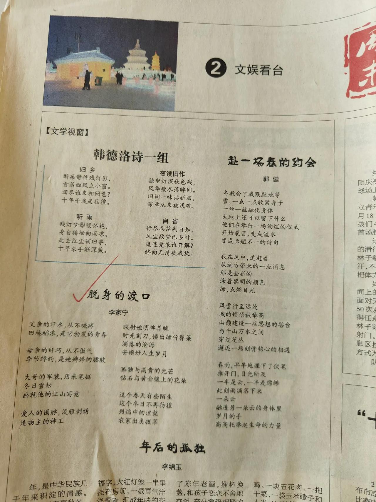 李家宁在报上发表31首诗(现代诗): 1、《面对大海》发表于《北海日报》2023、8、11 2《宏村写意》(外一首)发表在《中国企业家日报》2025、5、28 3、《皱纹》(外六首)发表在《广西广播电视报》2025、5、30 4、《风代替了我的手》发表在《温州日报》2025、5、24 5、《与迎客松互为倒影》《禾雀花》发表在《辽源日报》 2025、5、11 6、《千里走单骑的云朵》发表在 《西南商报》2025、5、20 7、《回故乡》发表在《澳门晚报》2023、8、3 8、《脱身的渡口》发表在《辽源日报》(周末关东)(2024、2、24) 9、《冰雪世界长白山》发表在《中国旅游报•副刊》(2024年11月28日) 10、《台湾好报》两首: 《春天印刷一桢桢油画》 《雨中抒怀》)(李家宁) 11、《欧洲诗人》(《故乡高仿》)(李家宁)​ ​12、《世界华人周刊》两首: 《海浪张着嘴 吻着热恋的土地》《2022这一年》 ​13、《香港诗人》六首: 《在翡翠这页宣纸上写诗》 (2024•夏季号)第46期 14、《把诗写在五岳上》 (2024•秋季号)第47期 15、《挂在苍穹上的香港》 (2024•冬季号)第48期 16、《政和八闽鸟:时光的羽痕》 (2025•春季卷)第49期 17、《迎客松的独白》 (2025•夏季卷)第50期 18、《去草原找昭君》 (2025•秋季卷)第51期 19、《“诗赏”奇秀武夷山》(上)、(下)发表在《闽北日报》(CN35—0052) 20、《走近诗意葱茏的洞宫山》发表在《闽北日报》(2021、10、12)((CN35—0052) 21、走进《神韵佛子山》发表在《闽北日报》(2021、11)(CN35—0052) ​