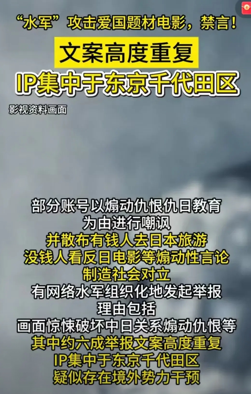 日本果然坐不住了,查到攻击《南京照相馆》和《731》等抗战电影的账号IP来自东京,文案高度重复,也就是通稿,现在封掉了一批账号了! 这次为什么日本这么破防,因为《南京照相馆》这些电影跟以前的抗战电影非常不一样了,完全没有按照西方那套思维逻辑去拍了,没有非得要有几个外国人在救中国人,也没有在日本人身上找人性闪光点了,跟以前那些夹带私货的导演不同了,完全就是从受害者的角度去还原真实的历史,日本肯定慌了,连欧美的媒体都在帮着日本,给这些抗战电影破脏水,因为南京照相馆没有按照它们的逻辑拍!