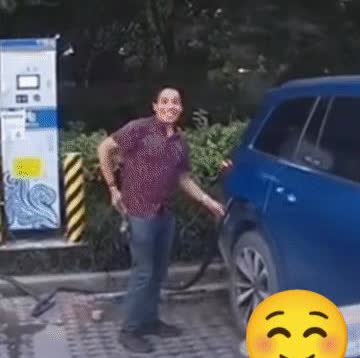 男子看到有车过来充电,他笑嘻嘻把充电枪拔出来扔到绿化带里,然后洋洋得意的回到了车
