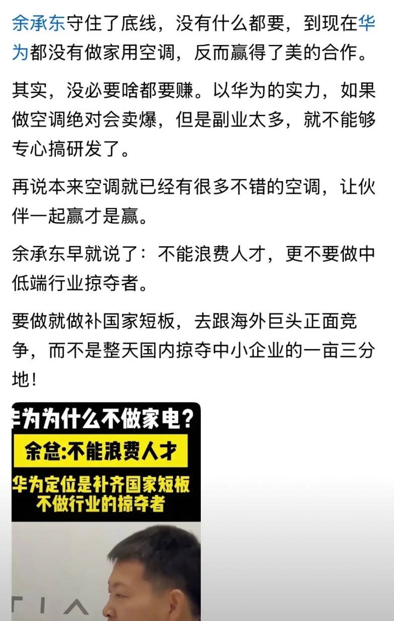 这就是余承东的格局,华为的格局!跟友商高下立判!不能啥赚钱做啥,卖冰箱空调,卖插排,又卖雨伞啥的,行业友商还怎么存活?华为给所有友商一条活路,没有抢他们的饭碗!