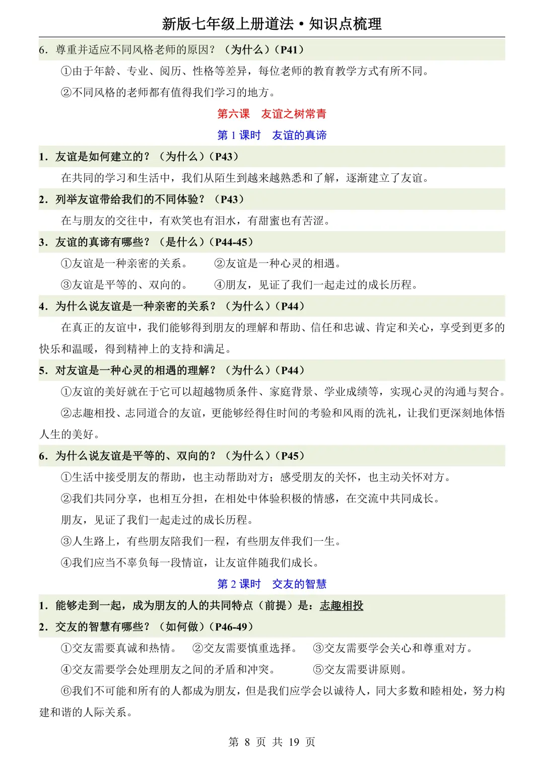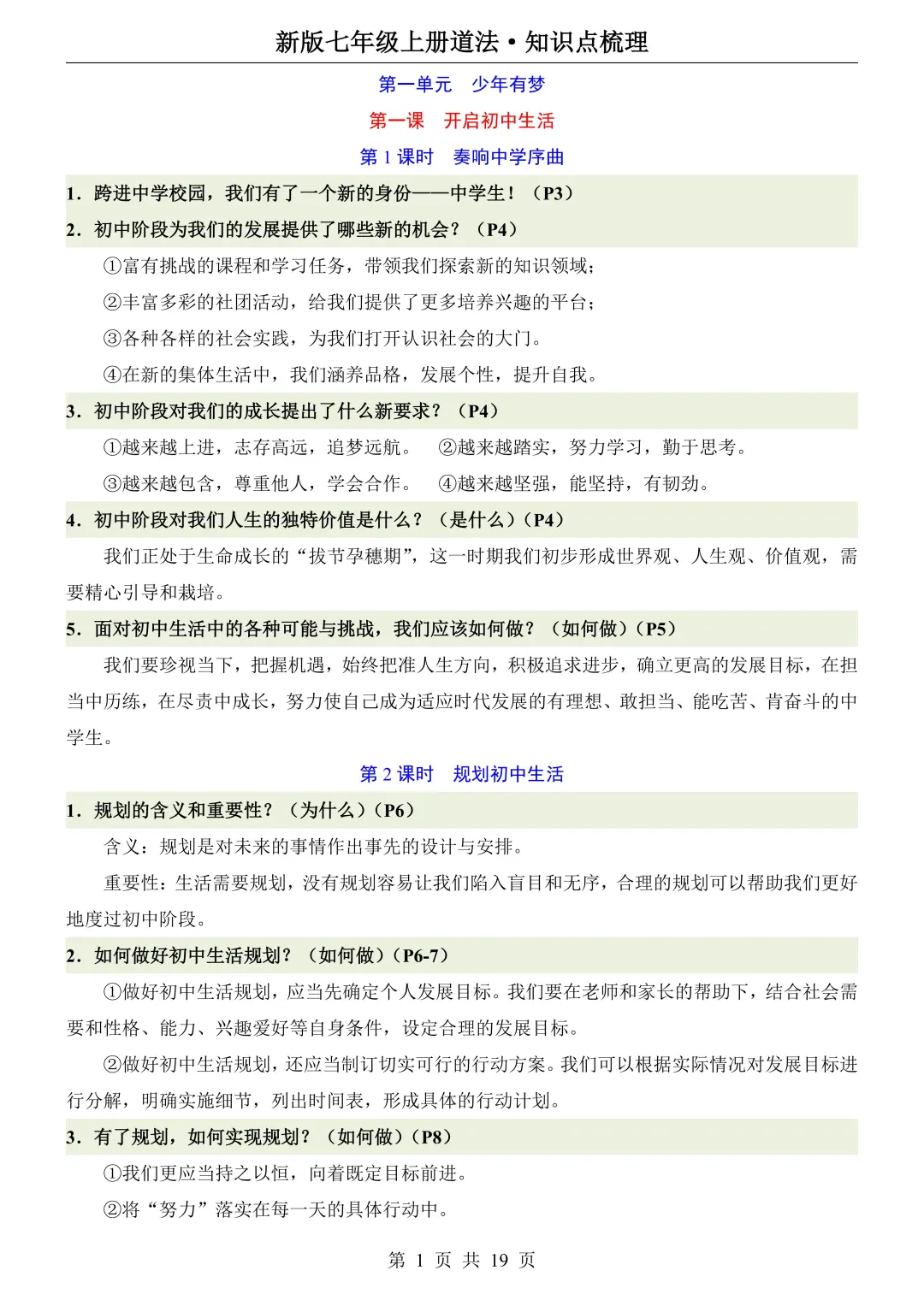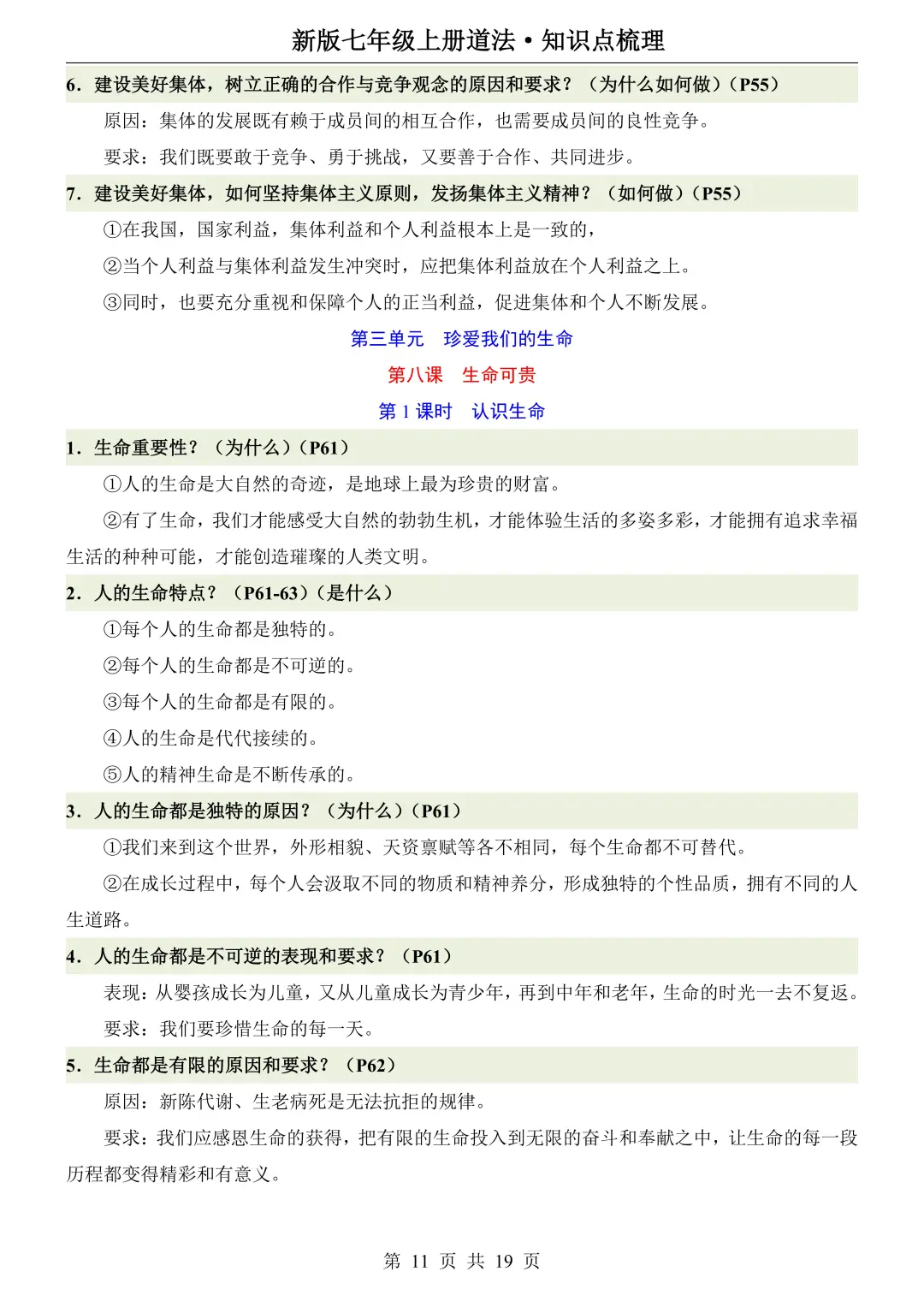 七年级 家长收藏孩子受益 七年级上册道法初一道法暑假预习 提高孩子学习成绩 必背知识点 政治笔记 七上道法 道德与法治
