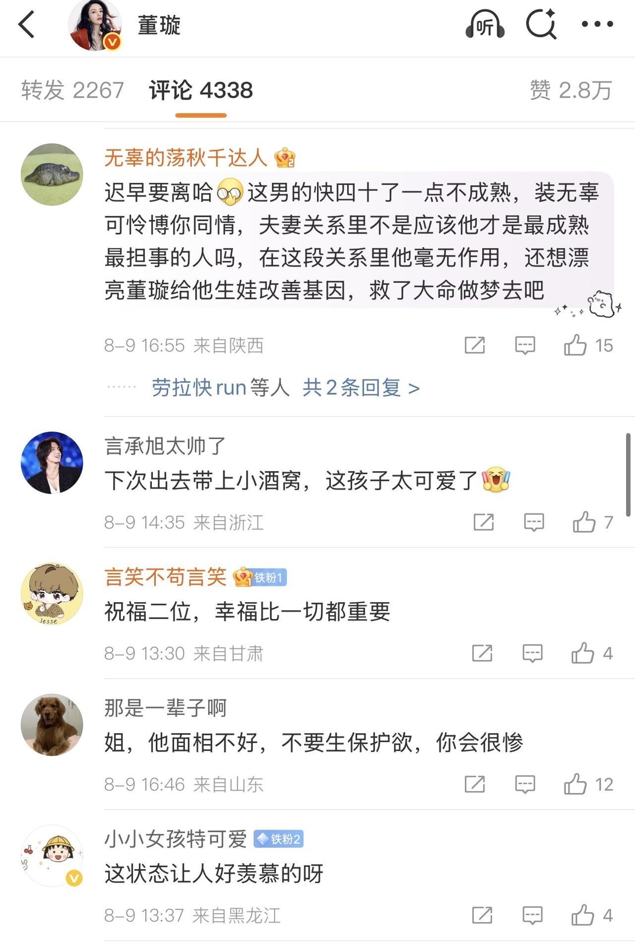 董璇官宣再婚,本是件开心的事情,可评论区的粉丝不买账,一点不手下留情,硬是在幸福的日子,留下不美好的言语,不知道董璇看了,会不会上火。很多人认为,董璇又美又有事业,为啥找了个这么其貌不扬,没有名气的男人,并且这男人面相让人不太舒服,粉丝真的为董璇担忧。其实感情的事情,谁又说得清楚,时间会证明一切!