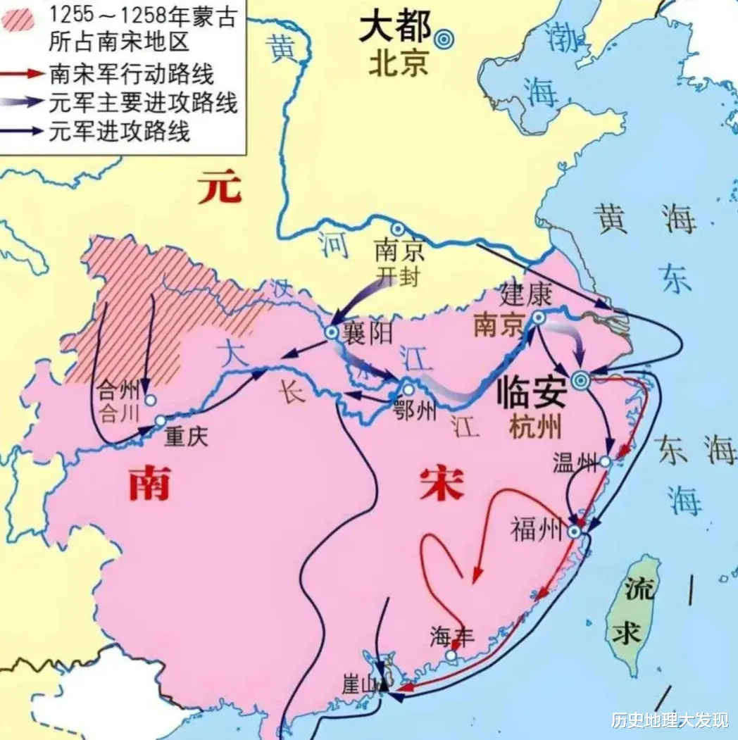 蒙元攻宋,蒙古军队在正面进攻南宋江淮防线的同时,采取了著名的迂回西南战略,1253年,蒙哥汗派忽必烈远征大理,实现对南宋的战略大包围,随后元军从云南、四川两个方向夹击,最终在1279年崖山海战中彻底灭亡南宋。