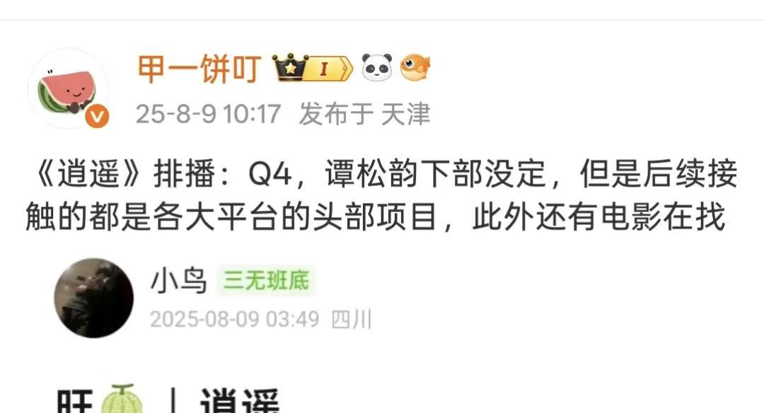 谭松韵资源了得呀,《兰香如故》拍完,下部剧还没定,但后续接触的都是各大平台的头部项目,另外还有电影在找,松韵真的好厉害,盼着她再拍一部电影,咱们都去电影院支持她,再见李可乐票房累计2.42亿,初战告捷啊! 逍遥将在Q4播出,这部剧播出咋这么难呢,盼星星盼月亮似的,好在是央视片单,可以上星播出,到时把遥控器都按起来,都看逍遥哦!预祝逍遥收视长虹!