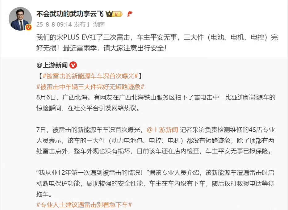 雷电验证比亚迪安全实力。此次事件再次印证了比亚迪“安全是电动车最大的豪华”理念。同时提醒:雷暴时车内相对安全,被雷击后请勿贸然下车,待雷暴结束再检查。