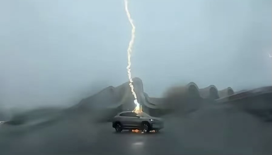 8月5日广西北海雷暴中,一辆行驶中的比亚迪宋PLUS EV在铁山港服务区连续三次遭闪电直击,车顶出现明显放电现象。车内女驾驶员毫发无伤,并顺利按原计划继续行程。
