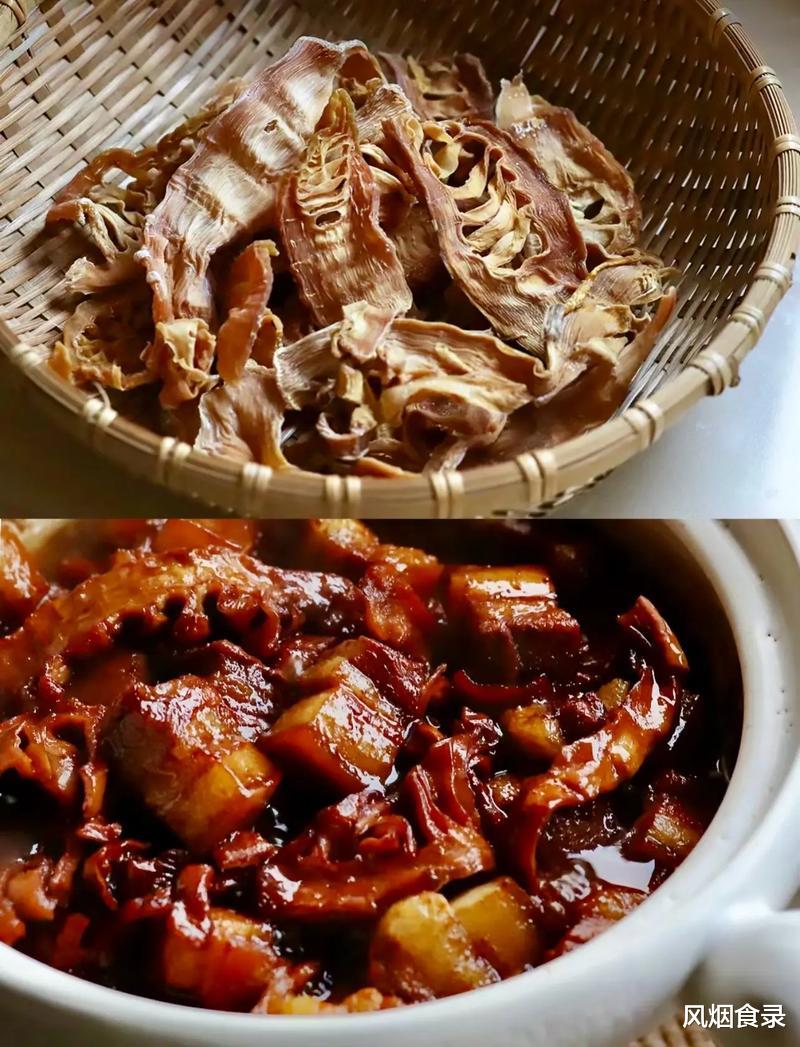 这道菜诞生于赣地竹乡,旧时山民为存鲜笋,将春笋晒成干,配着土猪五花肉慢炖,