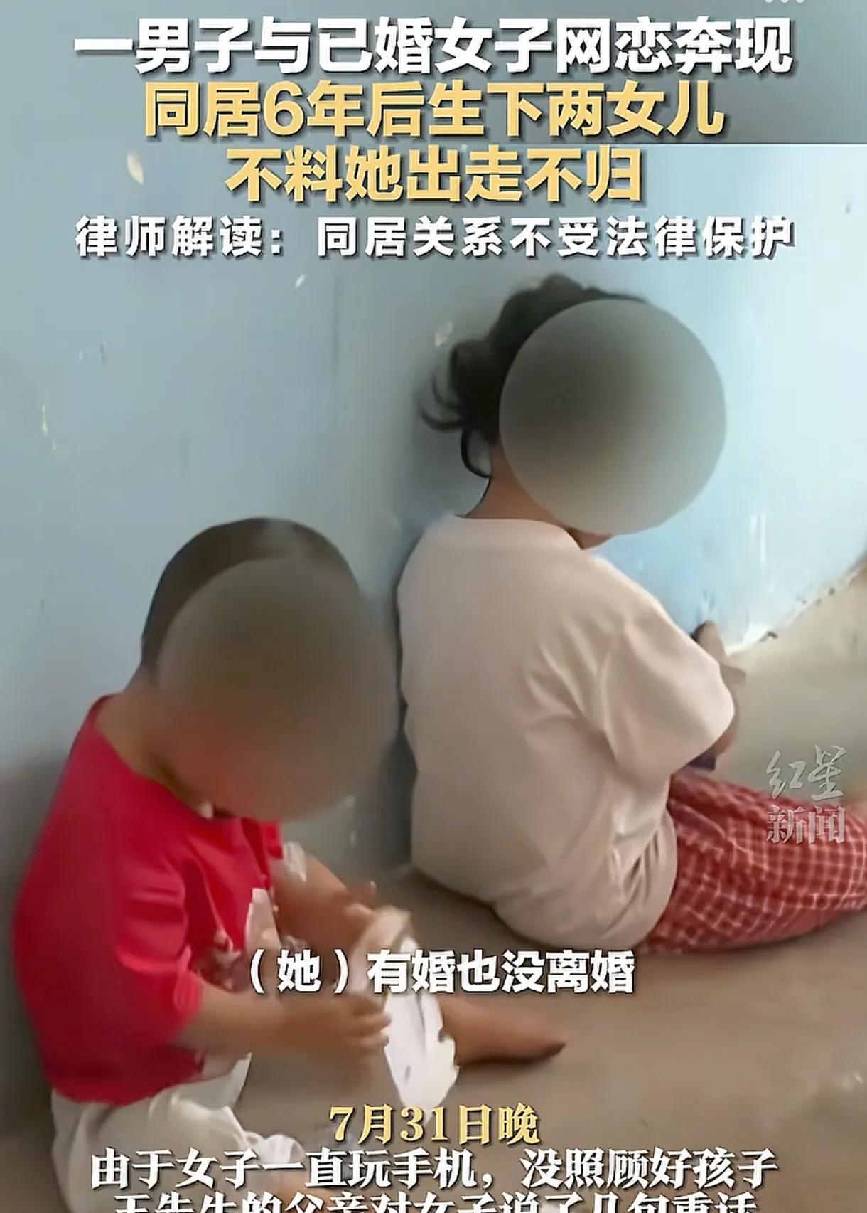 重庆,一男子和20岁女子网恋,将女子带回自己家生活,不料女子的母亲和丈夫找上门来,将对方接走,男子这才得知女子已婚。万万没想到,几天后,女子又回到了男子家,之后跟男子同居生活了6年,并生下了2个女儿,可女子因公公几句重话,突然离家出走,迟迟没有回家。男子傻眼:这段感情该何去何从,两个孩子又该怎么办? 2019年重庆潼南乡,王先生通过网恋认识了一个 20 岁左右的女子,俩人在网上聊得热乎,很快就产生了好感。 双方产生好感后,俩人商量着见面,如果感觉可以,那就继续发展下去,见面后,令王先生意想不到,女子居然表示愿意跟着王先生一起回到他们老家那边和他在一起过日子,王先生特别高兴,就把女子带回了自己家,想着能一起好好生活。 俩人在一起后,十分甜蜜,女子虽然啥也不干但是情绪价值很到位,王先生也很高兴,不出啥钱白得了个媳妇,王先生也很宠着该女子,啥好的都先由着她,可没成想,这平静的日子没过几天,女子的母亲和丈夫突然找上门来。 直到这时候,王先生才惊觉,原来女子早就结婚了。但女子不想离开,她告诉王先生自己很喜欢他,她和他现在的丈夫是家里安排的,她没感情。但没办法,俩人还是有结婚证,无奈之下,王先生只能看着女子被接走,本以为这段 “缘分” 就这么断了。 谁能想到,没过几天,女子自己又自己跑出来坐车,回到了王先生家,他既惊喜又意外,女子表示她已经和丈夫说清楚了,她要留下来好好和王先生过日子。从那以后,女子的娘家人和丈夫也没再上门找过。 这之后,王先生和女子就这么同居生活了 6 年,俩人十分开心,还陆续生下了两个女儿。日子虽然平淡,可也算有了烟火气,王先生大概也想着就这么过下去了。 可没想到,7 月 31 日晚上,因为女子一直玩手机,没照顾好孩子,王先生的父亲说了几句重话。就这么一件事,当天晚上,女子带着自己的身份证和户口本,一声不吭地离开了家,之后就再也没回来。 王先生这下慌了神,家里还有两个年幼的女儿,这日子可怎么继续?他满心期盼着女子能回来,可日子一天天过去,希望越来越渺茫。 这事儿在网上传开后,网友们也议论纷纷。有人说:这女子本身已婚还和别人同居,事儿办得太不地道,而且说走就走,显然很不负责任。心疼两个孩子,好好的家庭这下没了完整的模样。 还有人说:同居关系不受法律保护,这后续要是涉及孩子抚养、财产这些问题,处理起来麻烦事儿肯定不少 。 对此你怎么看?欢迎大家在评论区留言讨论。 信息来源:红星新闻 发布于2025年8月6日