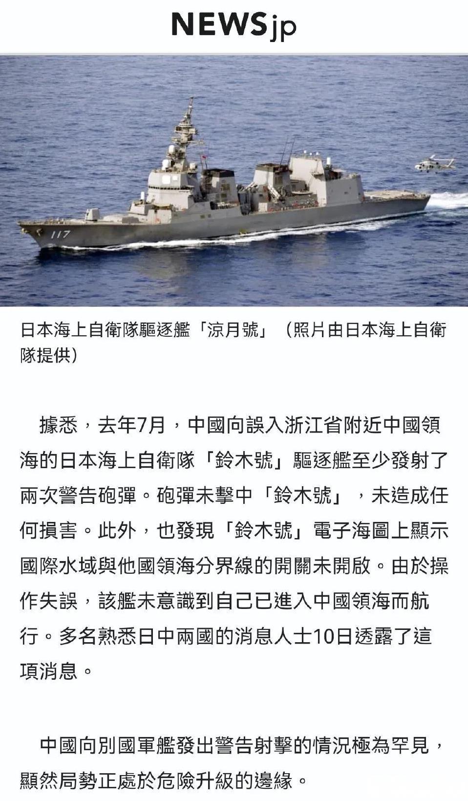 突发爆料!去年7月“误闯”我方领海的日本驱逐舰,遭我方军舰两次警告性炮击! 消息来源:日本媒体 8月10日据日本媒体《共同社》报道,近日日本自卫队向媒体透露,去年7月日本凉月号舰长操作失误(日方称是由于未开启电子海图)导致凉月号“误闯”中国领海,为此凉月号遭到了中方两次警告性炮击,炮弹落海后在凉月号旁激起了巨大水柱,凉月号随即掉头离开了我方领海! 这起事件去年在日本自卫队内部曾引起了巨大的震动!凉月号舰长不仅被撤职处理,连海军次长也引咎辞职,被处分的干部更是高达数十人! 不过有一点很奇怪,你们说说日媒为什么选择在这个时间点曝光这起事件呢?他们的目的是什么?