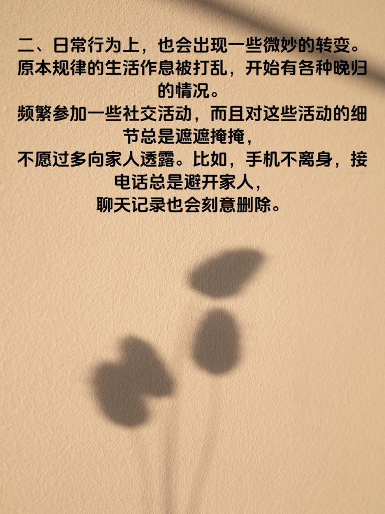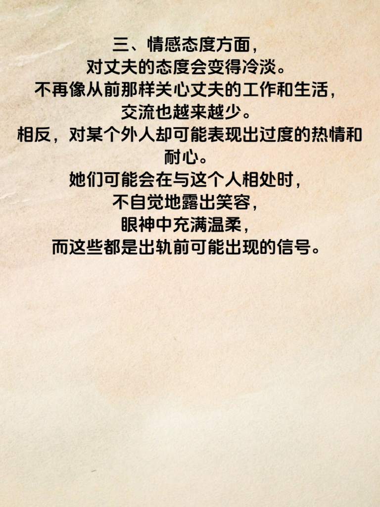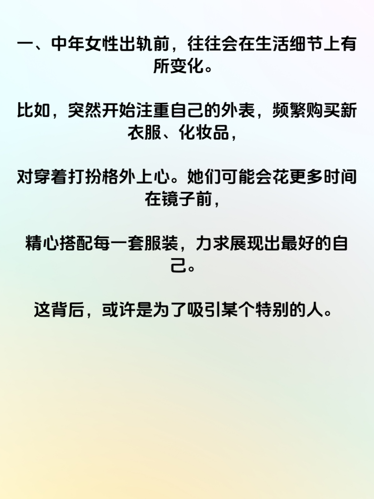 一、中年女性出轨前,往往会在生活细节上有所变化。比如,突然开始注重自己的外表,频繁购买新衣服、化妆品,对穿着打扮格外上心。她们可能会花更多时间在镜子前,精心搭配每一套服装,力求展现出最好的自己。这背后,或许是为了吸引某个特别的人。 二、日常行为上,也会出现一些微妙的转变。原本规律的生活作息被打乱,开始有各种晚归的情况。频繁参加一些社交活动,而且对这些活动的细节总是遮遮掩掩,不愿过多向家人透露。比如,手机不离身,接电话总是避开家人,聊天记录也会刻意删除。 三、情感态度方面,对丈夫的态度会变得冷淡。不再像从前那样关心丈夫的工作和生活,交流也越来越少。相反,对某个外人却可能表现出过度的热情和耐心。她们可能会在与这个人相处时,不自觉地露出笑容,眼神中充满温柔,而这些都是出轨前可能出现的信号。