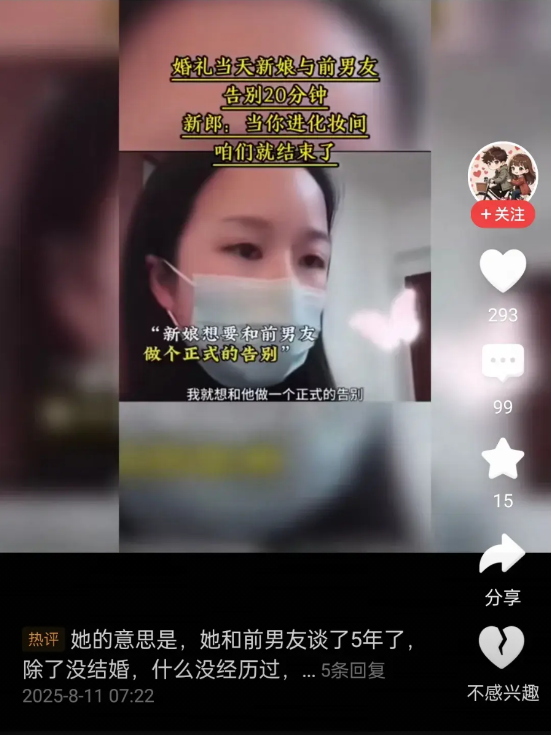 婚礼当天,新娘的前男友来找她,新郎要求新娘不要和他见面了。 新娘认为前男友和自己谈了五年,应该好好的告个别。 她没有遵循新郎的意见,和前男友告别了20分钟。 新郎当即取消了婚礼,他对新娘只说了一句话,当你进化妆间,咱们就结束了。 大家怎么看?