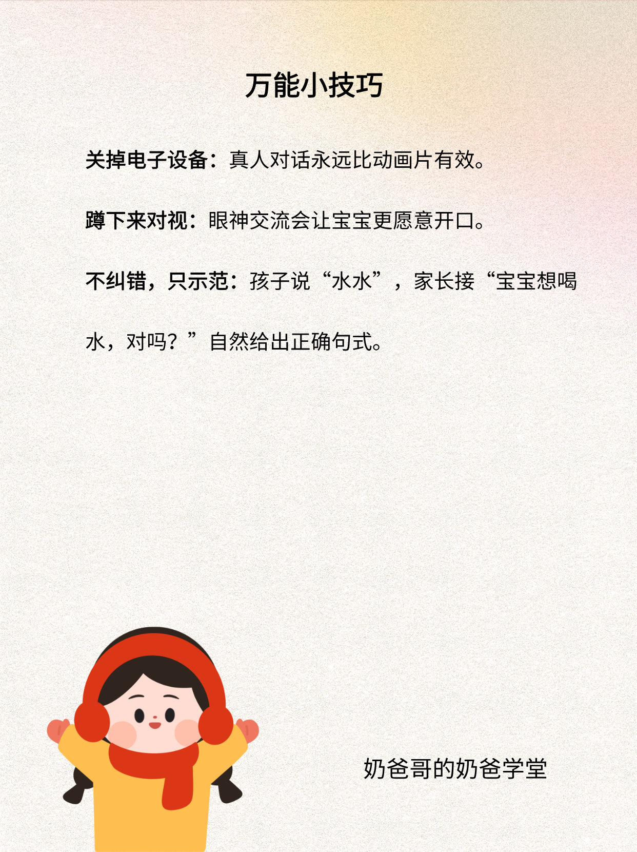 #奶爸育儿经# 宝宝的语言表达能力至关重要,培养宝宝的语言表达能力,其实就是“多输入、多输出、多反馈”三件事。下面奶爸哥给你一份0-3岁分龄实操清单,拿来就能用,让每一个孩子长大后都能掌握良好的表达能力。