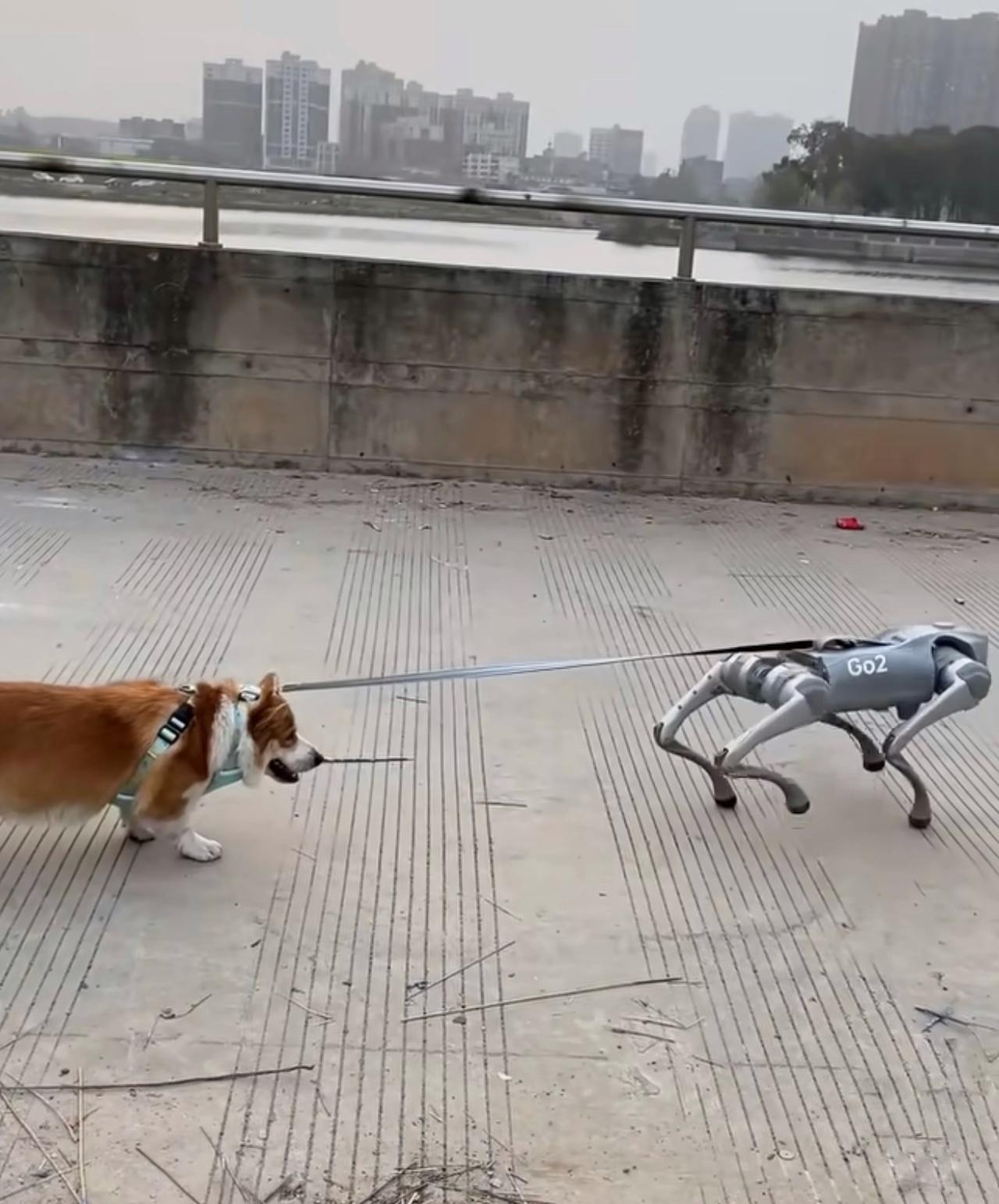 机器狗溜真狗这是哪位天才的想法啊!不知道是哪家狗主人想到了一个绝妙的办法,居然把自家的真狗拴在了一条机器狗身上。刚开始真狗还勉强能跟着走两步,不过没过多久被真狗发现牵着自己的是一条假狗,后面就已经很抵触这种行为了,通过各种方式来拒绝合作。如果这个想法真能成立,那么以后狗主人出门时先遛机器狗,机器狗再遛真狗,一下子遛了两条狗,这回头率直接拉满。不过这场景是不是有点像周星驰拍摄的电影《凌凌漆》,里面达文西开发的那只光照手电筒? #我的宝藏兴趣# #综合摄影#