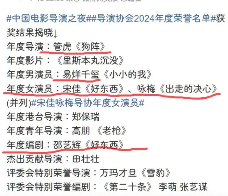 有人现在对管虎的《东极岛》发出评论。 我来提醒一下各位,这个行业的现状: 中国导演协会2024年的荣誉名单,相当于年度大奖吧。 《好东西》两个大奖。 《出走的决心》一个大奖。 某些流量明星,直接拿了最佳演员。 某些导演,拍了根本没听说的电影,又拿奖。 这就是这个行业。 我估计某些人恨死《哪吒2》,《唐人街探案1900》还有《南京照相馆》了。 这些剧组登了他们的“大雅之堂”吗? 结果票房如何?