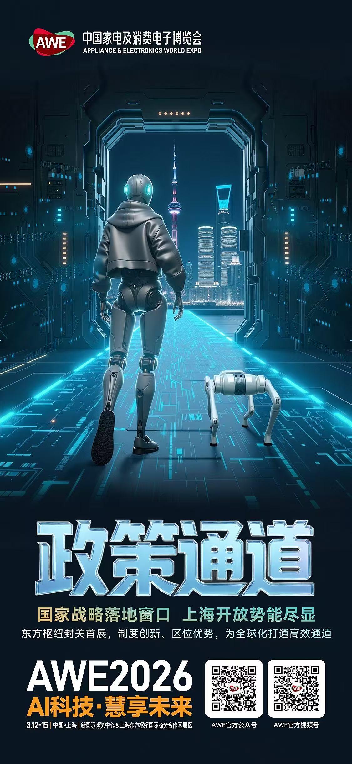 “AI科技,慧享未来”,AWE2026开启一展双区新时代。既是产业航标,也是政策