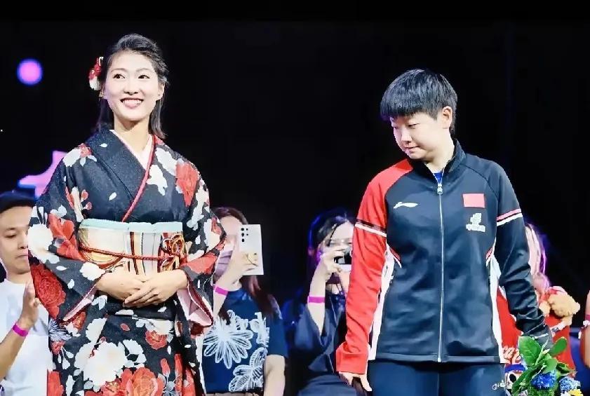 好喜欢莎莎这里的表情。横滨冠军赛,颁奖仪式上。小日子的穿着和服的引导员跟莎