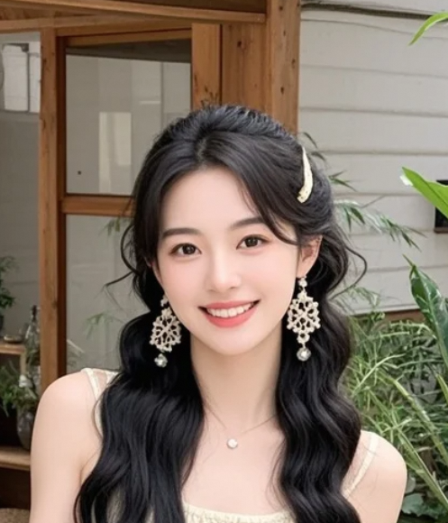 微卷长发慵懒扎起,她站在小屋前,笑靥如花,仿佛时间都为她停驻