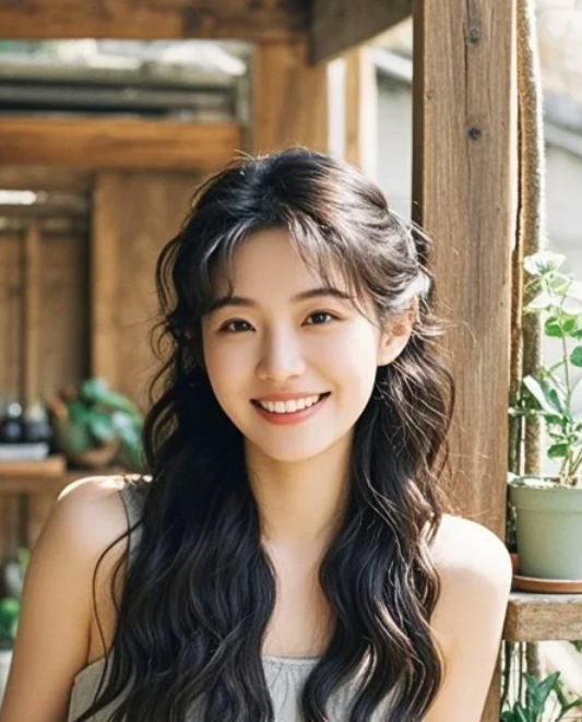 在绿意盎然的小屋旁,她的微笑如同春日暖阳,温暖而治愈