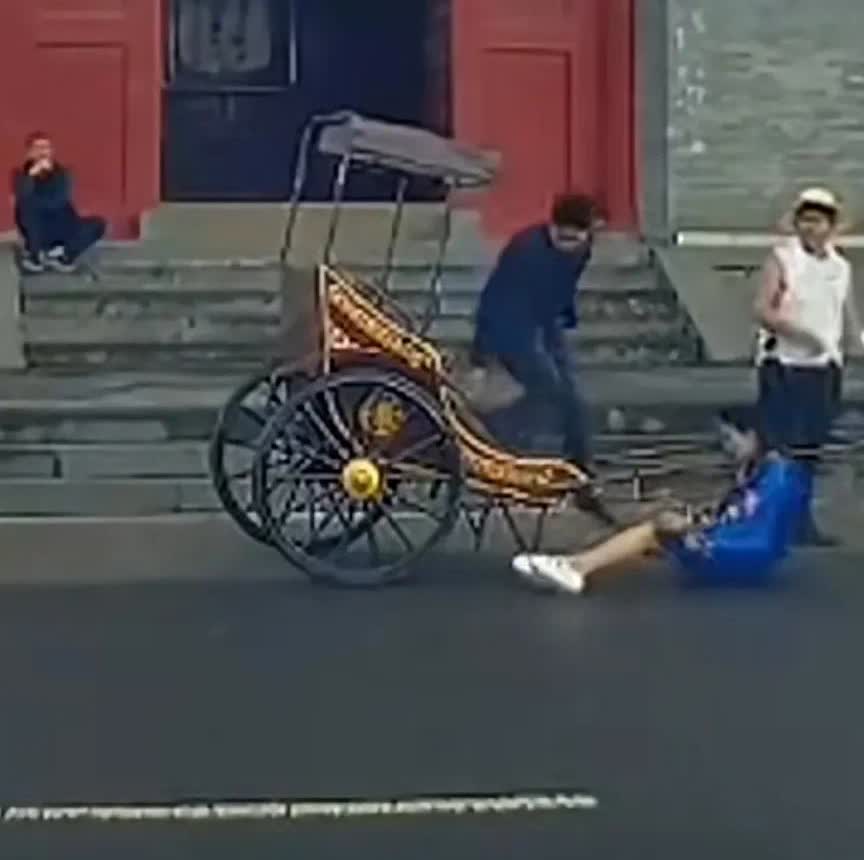 人别太坏了,景区拉黄包车的农民拉着一对情侣,拉黄包车农民在正常走着突然把黄包车放地上,随后坐车的情侣女子从黄包车上翻落在地,当时有游客目睹了这个过程,说这个拉车的农民工是故意的?要我说做哪一行都要讲良心,不要缺德,拉车的农民工是个混人,最起码你先站住再慢慢放下才能安全,大家评评理这个拉车的农民工到底有多坏?