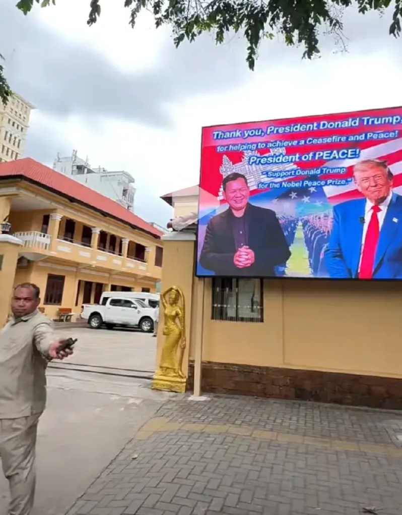 柬埔寨金边街边液晶显示屏上的广告,很有意思,洪森大儿子的表情好耐人寻味! 广告内容就是支持美国领导人获诺贝尔和平奖。 问题在于画面只有两个人,但明显洪马内的照片要小一号矮一截,有故意缩小之嫌。 咱就说也不至于这么“舔”吧! 脸上笑出的褶子都有沟深了,那边下巴高高扬起,这边低眉垂眼,双手十指交叉紧握! 面色红润,还挺激动,不知道得还以为他老爹给他发大奖状呢!