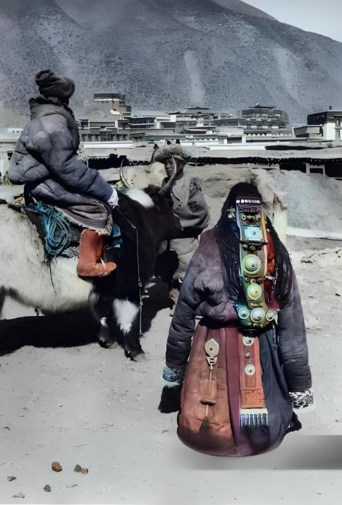 1920年夏河拉卜楞寺的黑白照片,背景是山峦与古朴寺院建筑,前景有骑牦牛的人,还有身着装饰繁复民族服饰的人物,尽显高原地域文化与历史感。