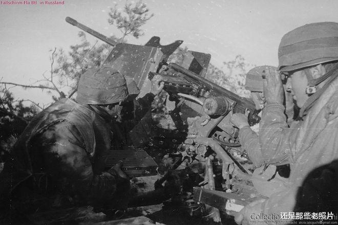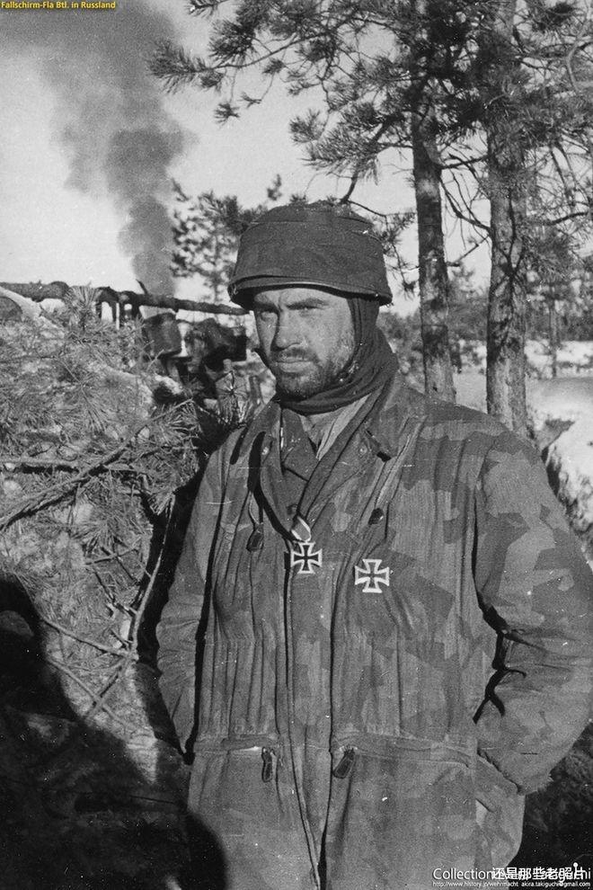 战壕中的一名德国伞兵,胸前配有两枚十字勋章,一枚为一级铁十字勋章,一枚为二级铁十字勋章。胡子拉碴的,一看就是老兵油子。