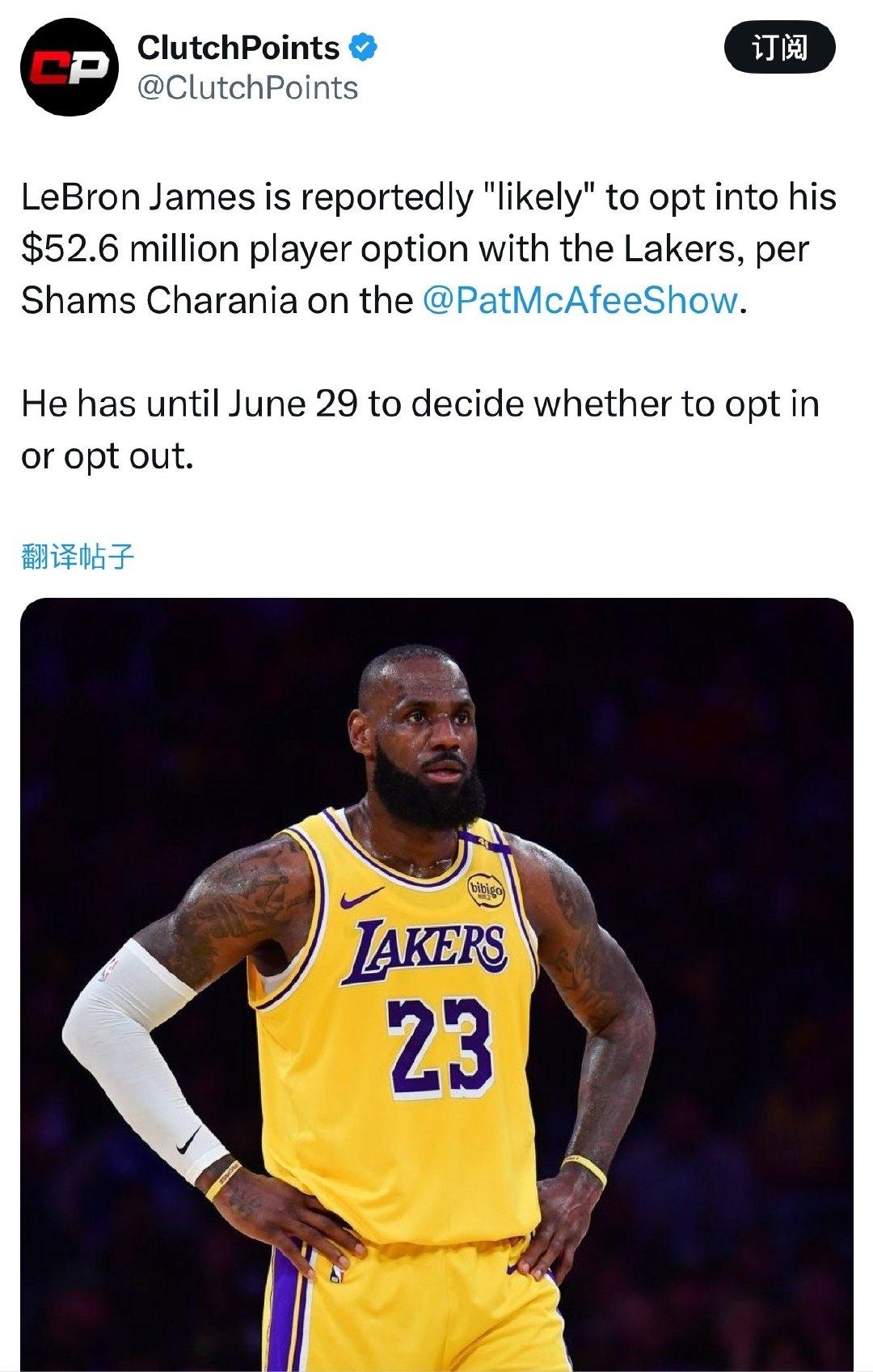 Shams:勒布朗-詹姆斯“很可能”会执行与湖人价值5260万美元的球员选项,是否执行,必须在 6月30日之前决定。 这将会是23号老将的第23个赛季,Shams还透露詹姆斯还会打多长时间,将取决于湖人在竞争环境中能够保持多久,下赛季很有可能会是詹姆斯的最后一季。 湖人 洛杉矶湖人 篮球 NBA