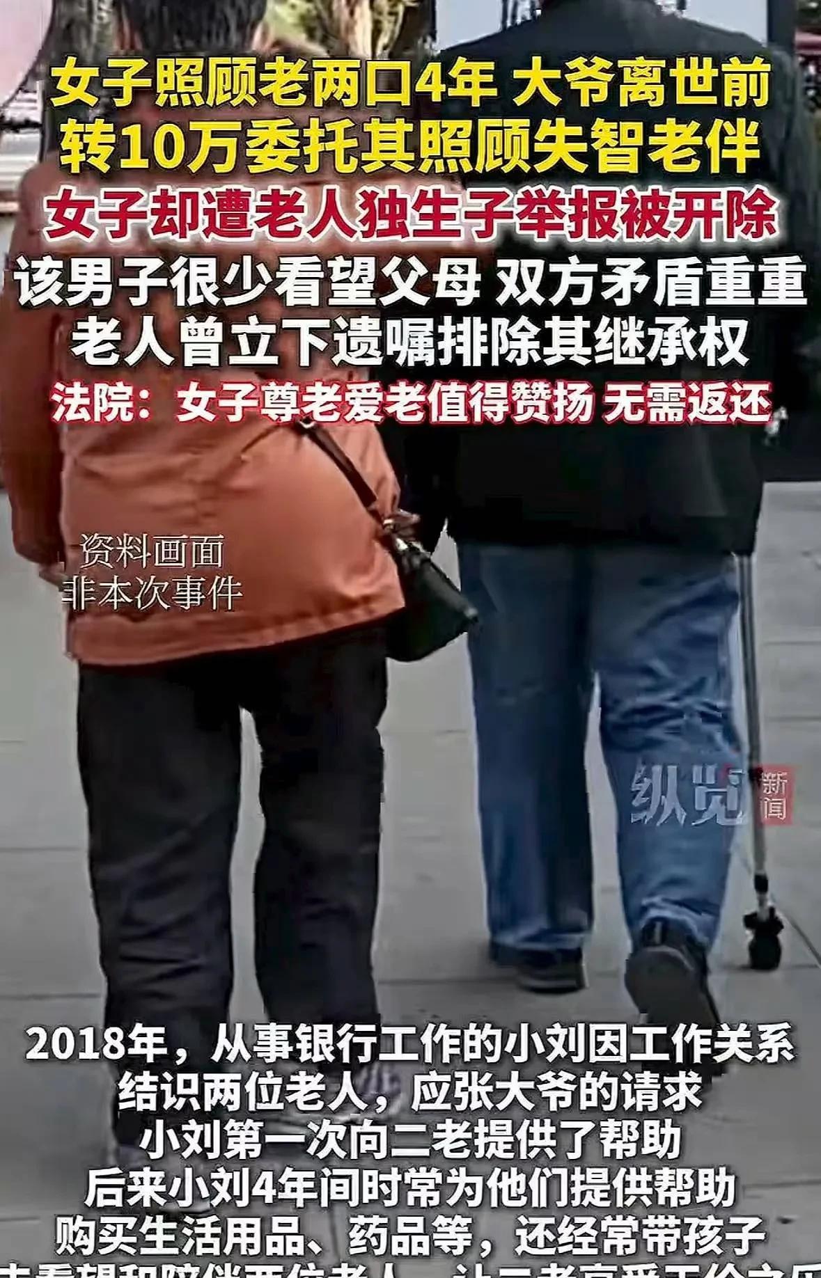 北京,8旬夫妇向女子求助帮忙,女子不仅分文不取帮助夫妇二人,还在此后4年内时常探望,为其提供力所能及的帮助。大爷离世前给女子转账10万,让帮忙照顾失智症老伴。夫妇独子知道后,到女子单位举报投诉,导致女子被开除。然后又起诉女子返还10万元,法院这样判决。 据红星新闻8月13日报道,女子好心帮助无人照看的八旬夫妇,到头来却被夫妇二人独自搞得丢了工作还要被起诉,这到底是怎么一回事呢? 小刘本是在银行上班的普通女子,就是因为一次工作关系认识了张大爷和其老伴。 张大爷跟老伴都已经80多岁了,张大爷的老伴李奶奶还患有失语症,夫妇二人看起来很是可怜,身边都每个人照顾,只有他们俩相互扶持。 张大爷有次需要人帮忙的时候,因为身边也找不到人帮助,不得已找到了小刘,希望小刘能够帮帮他们俩。 小刘看着张大爷为难的样子,小刘心有不忍。而且张大爷求助的事情也不是大事,小刘捎带脚的就帮忙给解决了。 张大爷很是感激,小刘能看得出来,张大爷是真心的在感谢小刘的帮助,让小刘动了恻隐之心。 从那次帮助后张大爷之后,小刘就隔三差五的前去张大爷家探望,在自己的能力范围内,为张大爷和老伴提供一些帮助。 其实张大爷跟老伴并不是没有孩子,俩人有个独子,只不过对于张大爷跟老伴都是不管不问的状态,一年到头都看不到几眼。 张大爷还几次跟小刘说,要立遗嘱,不让儿子继承遗产,他们实在是太寒心了。 别人的家事小刘不便评论,她只是做到自己觉得该做的事情就够了。小刘的这份善心持续了4年时间,直到张大爷病重。 张大爷在离世前特意把小刘叫到身边,给小刘转账过去10万元,希望小刘能继续照顾他老伴李奶奶,这10万元算是报酬。 小刘也不负所托,一直尽心尽力的照顾着李奶奶,虽然不是亲生,但是在外人看来,小刘就是李奶奶的亲女儿一般,都让人羡慕。 张大爷过世后,独子小张虽然小刘照顾其母亲的事情,但是并没有在意。直到听说小刘得到了张大爷给付的10万元后,才不断出现找小刘麻烦。 小张认为小刘得到10万元的目的不纯,家里还有他这个儿子在,轮不到外人指手画脚,小张表示能够照顾好母亲,就开始质疑小刘有诈骗嫌疑。 小张找到小刘的单位去闹,去举报投诉,导致小刘被单位给开除了。不仅如此,小张还让小刘把张大爷给转账的10万元还回来。 小刘拒绝还钱,小张几十年都没有尽到过赡养义务,又怎么会照顾好李奶奶,她要是走了,李奶奶的后果不堪设想。 双方协商不成,小张就带着李奶奶的名字一起,将小刘告上法庭,要求小刘归还10万元转账。 小刘拒绝归还10万元,不是因为她想要霸占10万元,而是小张索要10万元并非是为了李奶奶着想,而是另有目的。 据小刘所知,小张是张大爷的独子,所以从小就娇生惯养,长大后更是变本加厉。后来小张跟张大爷夫妇俩因琐事矛盾重重,无法解开,小张就扔下张大爷夫妇俩不管不问。 要是小张真的有孝心的话,就轮不到小刘照顾张大爷夫妇俩长达4年的时间,在这4年期间,小刘都没见小张出现过几次。 张大爷之所以在病重离世前还对小刘委以重任,让她照顾老伴李奶奶,都是因为小张靠不住,所以才愿意拿出10万元当做酬劳,让小刘帮忙照顾李奶奶。 4年间的相处,张大爷也知道小刘到底是什么样的人,所以才会对其委以重任。 反观看小张,张大爷跟老伴曾经2次立下遗嘱,要排除掉小张的继承权,可见张大爷对小张到底有多失望和绝望。 所以小刘并不认为小张能够照顾好李奶奶,所以拒绝返还10万元,还是由她照顾李奶奶的晚年。 小张则认为,小刘的目的不纯粹,得到10万元转账也是诈骗来的,所以要求小刘返还10万元。 《民法典》第157条的规定:当民事法律行为被认定为无效、被撤销或确定不发生效力后,行为人因该行为取得的财产应当予以返还。如果财产不能返还或者没有必要返还,则应当进行折价补偿。 小张认为自己完全可以照顾好自己的母亲,不用小刘的照顾。既然都用不上小刘照顾母亲,那么张大爷跟小刘约定的行为就被撤销了。 小刘因为要照顾李奶奶得到了张大爷给付的10万元,行为被撤销,小刘应返还取得的10万元。 法院审理后认为,小刘原本跟张大爷夫妻俩并无任何关系,但是却坚持照顾张大爷夫妻俩4年时间。 小刘的行为表现出了尊老爱老、助人为乐的善良品德。小刘这4年来不仅为两位老人提供生活上的帮助和照顾,还提供了情感上的关怀,填补了两位老人晚年生活的孤独。 小刘的行为应该得知被嘉奖和赞许,而不是像小张一样诋毁猜忌。因此法院最终判决,驳回小张的全部诉求。小张不服,提起上诉,二审维持原判。 对于小刘的遭遇,您又是怎样看待的呢? 关注@小栗子看法 一起交流讨论,学习法律知识!