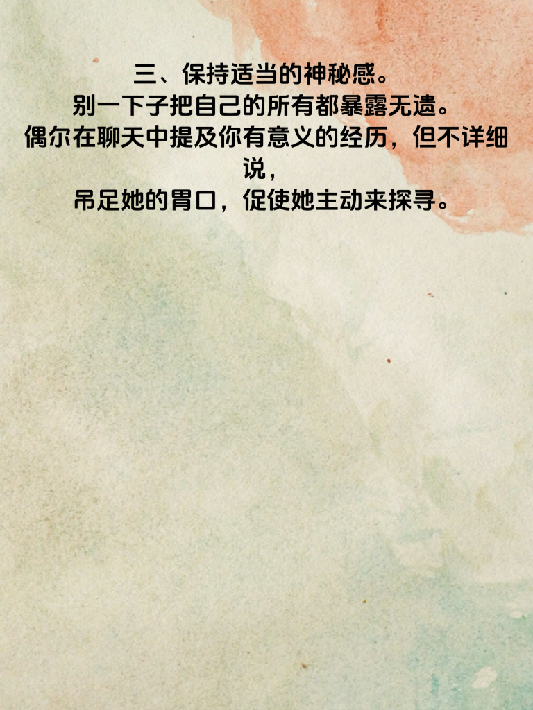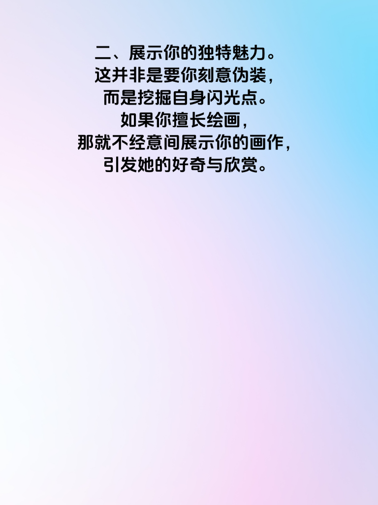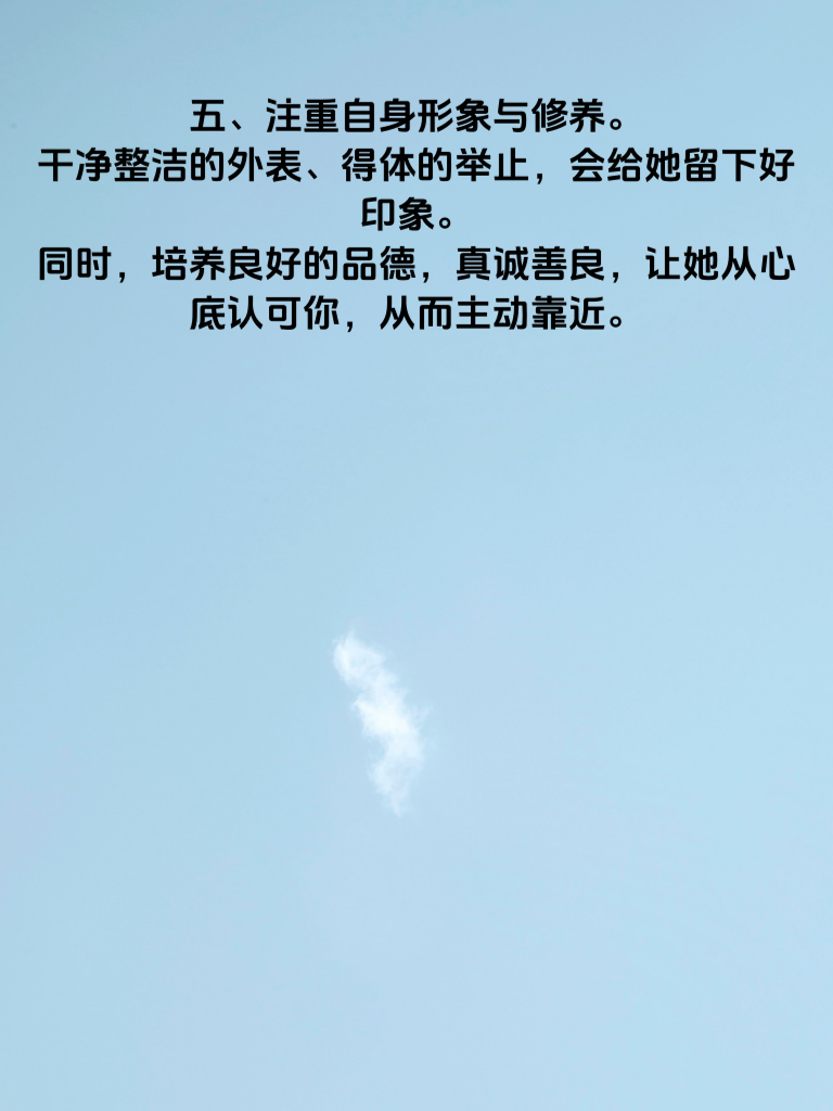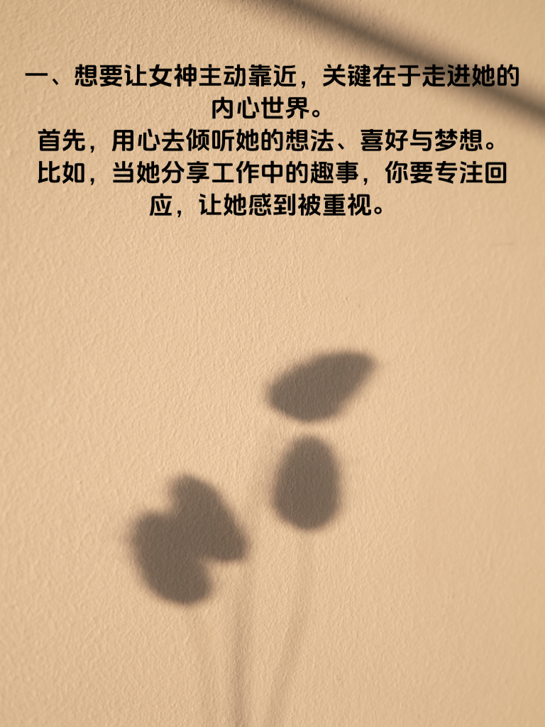 一、想要让女神主动靠近,关键在于走进她的内心世界。首先,用心去倾听她的想法、喜好与梦想。比如,当她分享工作中的趣事,你要专注回应,让她感到被重视。 二、展示你的独特魅力。这并非是要你刻意伪装,而是挖掘自身闪光点。如果你擅长绘画,那就不经意间展示你的画作,引发她的好奇与欣赏。 三、保持适当的神秘感。别一下子把自己的所有都暴露无遗。偶尔在聊天中提及你有意义的经历,但不详细说,吊足她的胃口,促使她主动来探寻。 四、建立共同兴趣。了解她喜欢的电影、音乐等,然后自己也去深入研究。这样你们就有了更多共同话题,能让交流更愉快,吸引她不断靠近你。 五、注重自身形象与修养。干净整洁的外表、得体的举止会给她留下好印象。同时,培养良好的品德,真诚善良,让她从心底认可你,从而主动靠近。