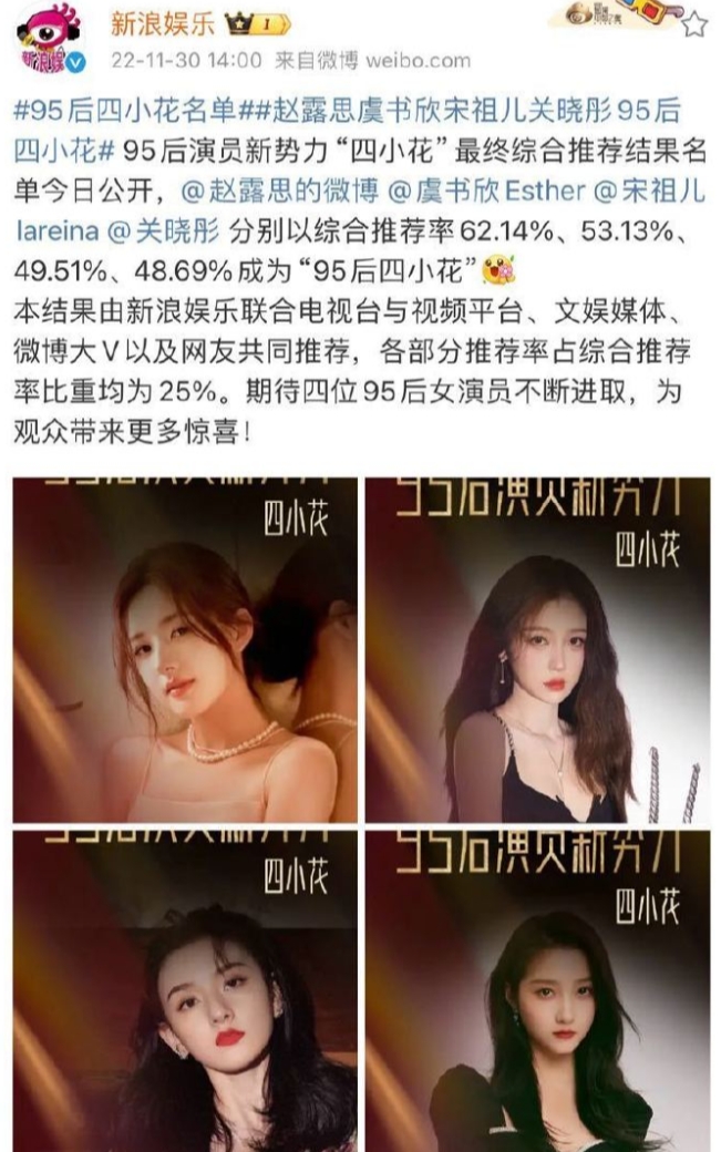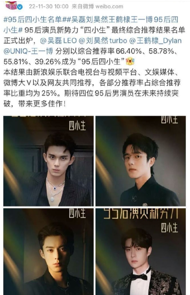 四小生:吴磊,刘昊然,王鹤棣,王一博,四小花:赵露思,虞书欣,宋祖儿,关晓彤。尽管中间有挺大变化,但是目前来看,三年过去了,格局依旧没什么变化,四小生都进了电影圈,小花这边,赵露思前途迷茫,宋祖儿强势回归,虞书欣如日中天,关晓彤中流砥柱。