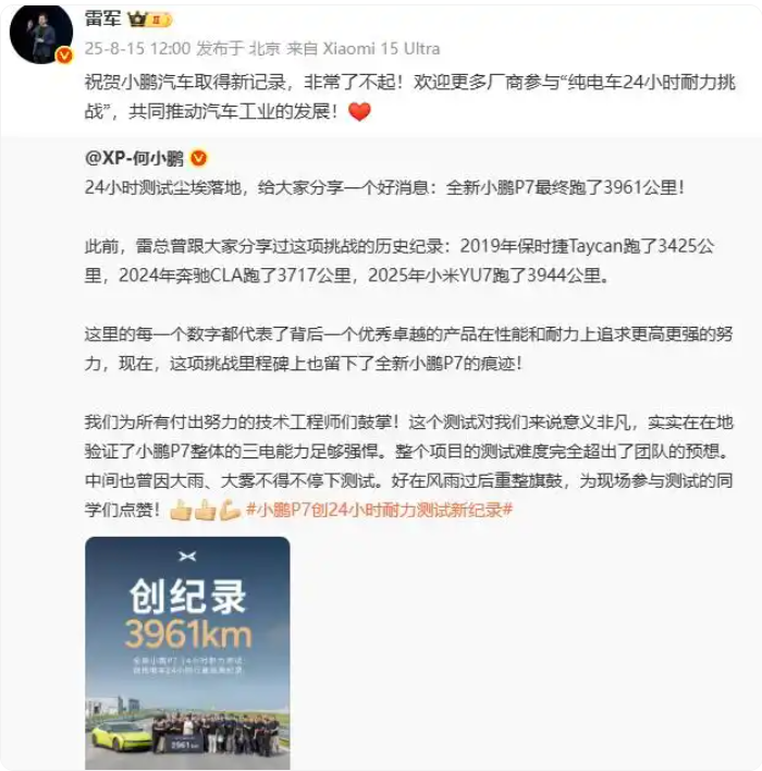 都是兄弟:雷军祝贺小鹏汽车新纪录! 今天下午 ,雷军大气的在社交网络向小鹏表示