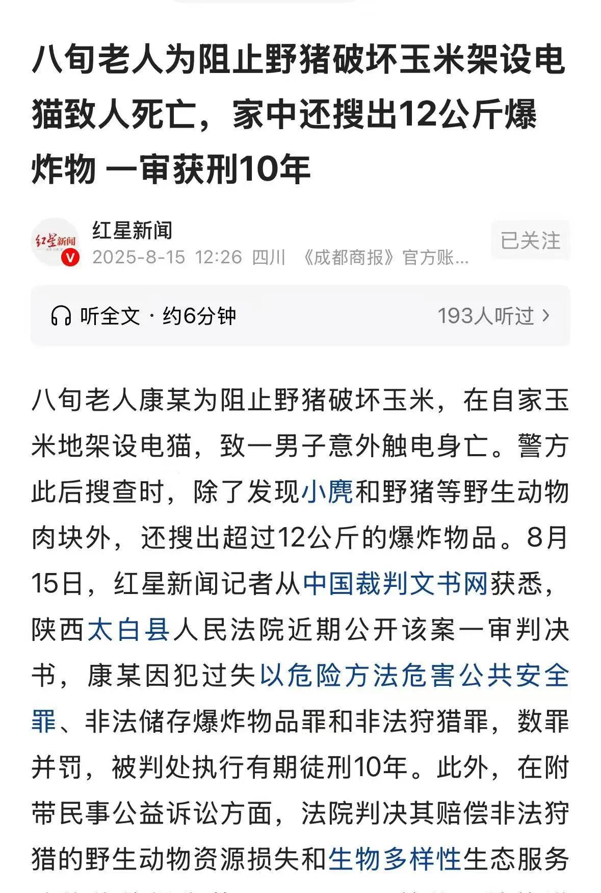 陕西太白,男子跟妻子晚上回家时穿过玉米地,男子意外触电身亡。男子女儿报警后,才得知玉米地里竟然被83岁老汉架设了电猫,老汉说是为了防止野猪破坏玉米。双方协商达成一致,老汉赔偿33万,得到男子家属谅解。可老汉电猫的由来,警方还是要上门搜查的,这一搜查不要紧,竟然发现老汉家中有有爆炸物品和野生动物肉,被依法提起公诉,法院这样判决。 据红星新闻8月15日报道,老汉本想着防止野猪破坏玉米地,架设了电猫,却意外伤人。老汉虽然得到逝者家属谅解并赔偿33万,但还是因家中存有大量爆炸物品被提起公诉。 康大爷年轻的时候就爱好打猎和捕鱼,但毕竟那只能作为爱好,不能养家糊口,于是康大爷后来就到县城里找了个班上,直到退休才又回到镇上。 康大爷家里有地有池塘,虽然退休了,但也不能闲着,得把地利用起来种了玉米,正好还能贴补点家用。 可是玉米地里经常遭受到野猪的破坏,收成日渐减少。康大爷实在是忍无可忍,于是在2024年6月30日的晚上,从小仓房里找出电猫架设在玉米地四周。 白天康大爷不敢用电猫,怕伤了人,就自己在玉米地里看着。但是晚上他就没办法了,只能将电猫通上电,希望能把那野猪电死。 凌晨时分,康大爷被门外的叫喊声吵醒,说是有人在他的玉米地里出了事。康大爷知道肯定是电猫伤了人,赶紧爬起来前去查看情况,可事实却比康大爷想的更糟。 原理李某跟妻子回家的路上就会经过康大爷家这片玉米地,穿越玉米地回家是最快的办法,但没想到平日里都无事的玉米地,竟然被康大爷架设了电猫。 李某意外触碰到了电猫,当场身亡。李某的女儿久久没看到父母回家,出门寻找时才发现父亲已经身亡,赶紧报警。 经过鉴定,李某系电击死亡,而且正好是在康大爷家的玉米地出的事情。警方经过调查后发现,就是康大爷架设的电猫夺走了李某的性命。 《刑法》第341条第2款的规定:违反狩猎法规,在禁猎区、禁猎期或者使用禁用的工具、方法进行狩猎,破坏野生动物资源,情节严重的,处三年以下有期徒刑、拘役、管制或者罚金。 康大爷私自架设电猫,本来就违反了规定,要是查明是用于狩猎的话,还会被判刑并处罚金。 但是康大爷一再解释是为了防止野猪破坏玉米地的无奈行为,李某的死亡是意外,并非故意的,而且康大爷愿意做出赔偿,只要李某家属索要的金额合理。 李某家属看康大爷那么大岁数也怪不忍心的,提出了33万的赔偿金额,没想到康大爷一口答应了下来。 毕竟人死不能复生,李某家属也没有再过多的追究,双方达成一致后,康大爷赔偿了33万元,李某家属也出具了谅解书。 但是康大爷电猫到底是不是只是单纯的用于防止野猪破坏玉米地,警方还是要搜查看一看的,于是在4天后来到康大爷家搜查。 这一查不要紧,康大爷家的东西可真不少。光是疑似软管炸药就39管,发射管30个,还有其他各种类型的散装火药之类的爆炸物,林林总总加一起有1.2万多克重。 康大爷只不过是一个83岁的老头,哪来的这么多爆炸物品,是从哪里取得的,又用于干些什么呢? 康大爷表示,早在20世纪80年代开始,他就购买等方式取得了这些东西,主要是用于打猎和炸鱼使用,并未用作其他用途。 康大爷家不仅有爆炸物品,还有很多野生动物的肉块,都是康大爷打猎回来的战利品。康大爷觉得都是野猪野鹿,宰了吃肉也没什么事情。 殊不知康大爷这些野生肉块里,有重要生态、科学、社会价值的小麂1只,还有野猪一头。他们除了有自身的价值3500元外,还有功能价值共计6209.71元。 《刑法》第115条的规定:放火、决水、爆炸以及投放毒害性、放射性、传染病病原体等物质或者以其他危险方法致人重伤、死亡或者使公私财产遭受重大损失的,处十年以上有期徒刑、无期徒刑或者死刑。 过失犯前款罪的,处三年以上七年以下有期徒刑;情节较轻的,处三年以下有期徒刑或者拘役。 虽然李某家属谅解了康大爷,康大爷也给与了一定的赔偿,但毕竟过失导致李某的死亡,应当追究其刑事责任。 而且康大爷家中还存放着爆炸物品以及野生肉块,康大爷还违规狩猎,应当数罪并罚。 但康大爷已经年满75周岁,且已经得到逝者家属谅解,康大爷认罪认罚,可从轻处理。 最终法院以康大爷犯过失以危险方法危害公共罪、非法储存爆炸物品罪、非法狩猎罪数罪并罚,决定执行有期徒刑10年。 没收康大爷的电容箱、捕鱼器,将各种爆炸物品移交给职能机关处理。康大爷赔偿需赔偿9709.71元,并在县内媒体公开赔礼道歉。 对于康大爷的遭遇,您又是怎样看待的呢? 关注@小栗子看法 一起交流讨论,学习法律知识!