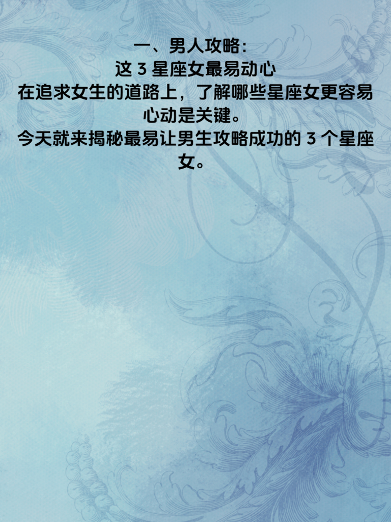 一、男人攻略:这3星座女最易动心\n在追求女生的道路上,了解哪些星座女更容易心动是关键。今天就来揭秘最易让男生攻略成功的3个星座女。\n 二、首先是天秤座女生。她们天生对美有着敏锐的感知,注重生活中的各种细节。如果你能展现出自己独特的品味,无论是穿着打扮还是生活态度,都能吸引她们的目光。比如精心准备一次浪漫的约会,用精致的布置和贴心的安排,让她们感受到你的用心。天秤座女生很吃这一套,往往会因此对你心动。\n 三、其次是双鱼座女生。她们内心充满浪漫幻想,渴望被爱包围。给她们讲一些动听的情话,为她们制造一些惊喜瞬间,比如突然出现在她们面前送花,或者在特殊的日子准备一份有意义的礼物。当她们沉浸在你营造的浪漫氛围中,很容易就会对你心动不已。\n 四、最后是白羊座女生。她们性格直爽,喜欢有行动力的男生。在她们面前,展现出你的勇敢和果断,主动约她们去做一些有趣的活动,比如户外运动等。积极参与她们的生活,让她们看到你的热情和真诚,这样她们也很容易被你打动,从而心动。