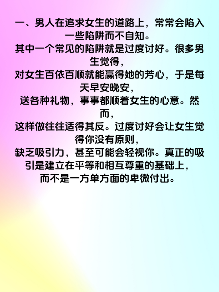 一、男人在追求女生的道路上,常常会陷入一些陷阱而不自知。其中一个常见的陷阱就是过度讨好。很多男生觉得,对女生百依百顺就能赢得她的芳心,于是每天早安晚安,送各种礼物,事事都顺着女生的心意。然而,这样做往往适得其反。过度讨好会让女生觉得你没有原则,缺乏吸引力,甚至可能会轻视你。真正的吸引是建立在平等和相互尊重的基础上,而不是一方单方面的卑微付出。 二、另一个陷阱是急于求成。有些男生刚认识女生不久,就迫不及待地表白,或者想要迅速确定关系。这种急切的态度会给女生带来很大的压力,让她觉得你不够稳重,不够靠谱。感情是需要时间来慢慢培养的,心急吃不了热豆腐。你应该先和女生建立良好的沟通与互动,增进彼此的了解和信任,等时机成熟了,再自然而然地推进关系。 三、还有一个容易犯的错误是忽视自身成长。在追求女生的过程中,有些男生把全部精力都放在了女生身上,却忽略了提升自己。要知道,一个有魅力的人,不仅仅是外表吸引人,更重要的是内在的品质和能力。你应该不断学习,提升自己的修养、学识和技能,让自己变得更加优秀。当你自身散发着独特的魅力时,自然会吸引到那个与你契合的女生。避开这三个追女生的陷阱,才能让你的追求之路更加顺畅。