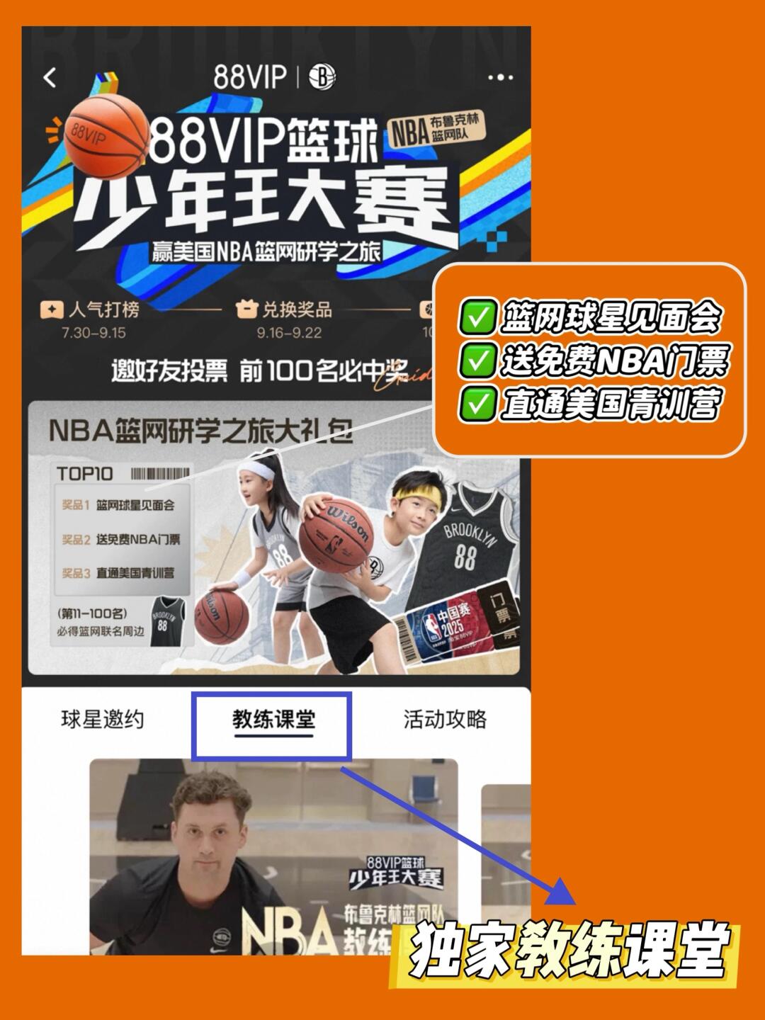 按照视频点赞数排名发奖品,还有机会拿【NBA篮网研学之旅】大礼包、球星见面会、免费NBA门票、直通美国青训营!