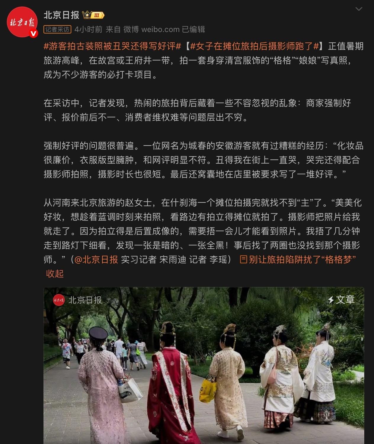 游客拍古装照被丑哭还得被迫写好评事件,说句大实话绝大多数人穿古风衣服都很难看,好看的只是极少部分,尤其是清宫服装。从事古风人像摄影多年,也算是半个业内人士了吧。然而你们可能会反驳,觉得网上的古风人像都很好看,一个普通姑娘拍出来都很好看。其实,这些都得益于摄影师拍摄时选择角度、光影、构图等,再加上后期修图补救后的结果。这两个环节任意一个环节出问题,清宫写真更会翻车到哭,而翻车又是大概率事件。尤其是低价单,修图用的是Ai修图,大约每张的成本就三五毛钱。别看AI修图广告样片看起来很牛,但那只是经过选择后的照片,普通照片修出来的效果其实很一般。所以,这件事其实是个普遍现象。美女们在选择拍摄时,一定要记得不要选择低价单、不要选择低价单! #我的宝藏兴趣# #综合和摄影#