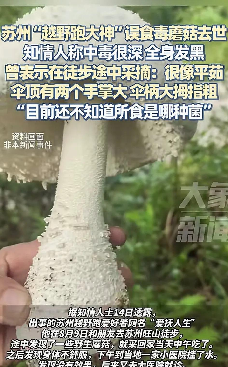 又一位越野跑大神陨落了。 他没有败在突破极限的路上,而是败在了毒蘑菇手里,吃完后不是产生幻觉,而是中毒后全身都发黑了。 据了解,这位大神是在9号徒步的时候,在路边捡到的蘑菇,当天吃了身体就不舒服,然后去小医院挂吊水,发现没效果才是的大医院,11号进了icU,12号人就没了。 还有人在评论区问:怎么分辨有没有毒呢? 劝你们还是不要去分辨了,因为这些蘑菇有很多,有毒的、没毒的很相似,除非是专业人士,普通人那就是嫌命长了。 我个人觉得如果外地想要自己去捡野生菌的话,还是找一个当地的人带着去,哪怕给一点钱,让他带着你去,最起码他生活在本地,知道哪些能吃哪些不能吃。 这位大神也是个愣头青,这一看就知道不能吃啊![祈祷]