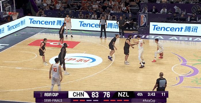 图一:赵睿弧顶借掩护以后往里突破,新西兰球员戴维森一看有些防守失位,直接一个顶肩将赵睿撞倒在地。随后裁判回看以后给到违体犯规,赵睿两罚全中 图二:赵睿被恶犯以后的球权,在弧顶一个突施冷箭,三分球稳稳命中,连得5分将分差扩大至10分