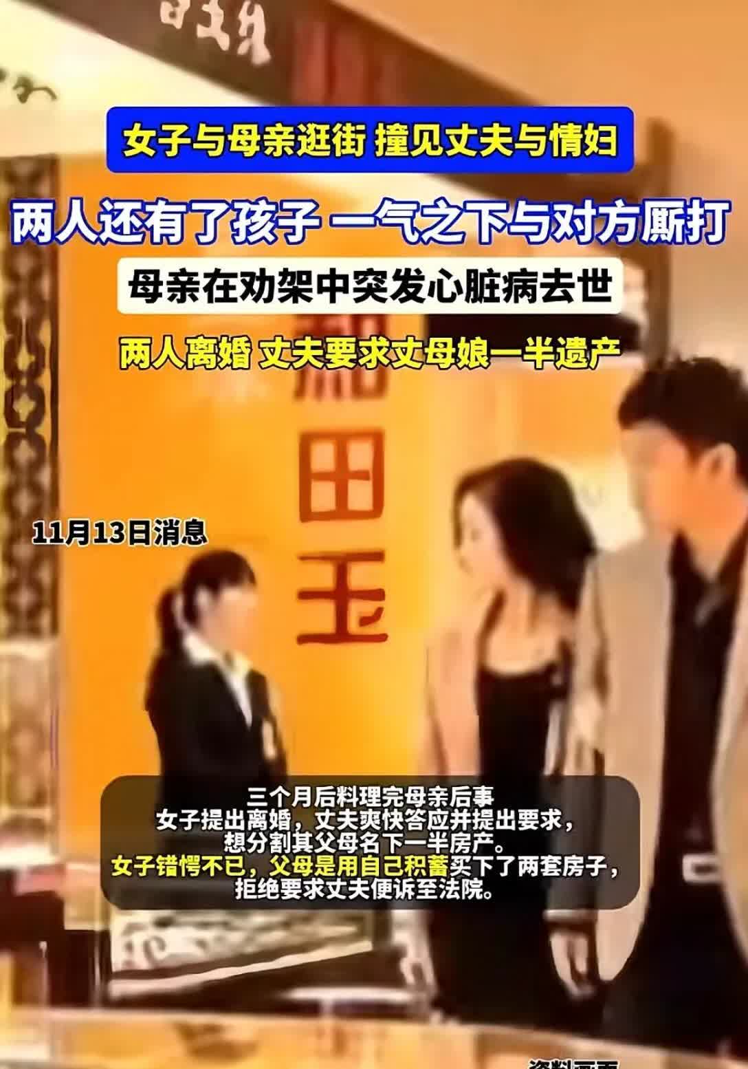 浙江,女子带母亲出门逛街,竟撞见丈夫挽着别的女人的手,2人还有了孩子。女子气坏了,冲上去和他们打在一起,没成想,母亲在劝架过程中突发心脏病离世。事后,女子提出离婚,男方同意了,却要求分割女子父母名下一半财产。女子不愿意,男方直接把她告上法庭,女子最终输了官司。 这是一件因为老公出轨、家里出事导致的财产争夺事情。浙江的方静,有次带着心情不好的老妈去逛街,结果半路上碰到老公刘也和一个不认识的女人手拉手,旁边还有个小孩管刘也叫“爸爸”。方静一看就火了,上去就和刘也吵了起来。这时候,老妈过来想劝架,结果一下子心脏病犯了,倒在地上,送到医院也没救回来。 老妈走了之后,方静心里特别难过,觉得这都是刘也害的。过了几个月,方静就提出要和刘也离婚。刘也倒是答应得挺快,但他说要分方静爸妈买的房子。方静一听就不乐意了,觉得这房子是爸妈辛苦挣来的,跟刘也没关系。可是刘也非要争,还把方静告上了法院,最后法院也没站在方静这边。法院经过审理,觉得方静她妈在走之前没写遗嘱,所以财产就按照法律给了方静。但这事儿发生在方静结婚之后,所以这钱就算是他们两口子共有的,刘也有份要。最后,方静打官司打输了。 因为一些家庭矛盾,事情越闹越大。结果方静不仅没了妈妈,还因为法律,不得不跟老公分掉一部分爸妈留下来的钱。