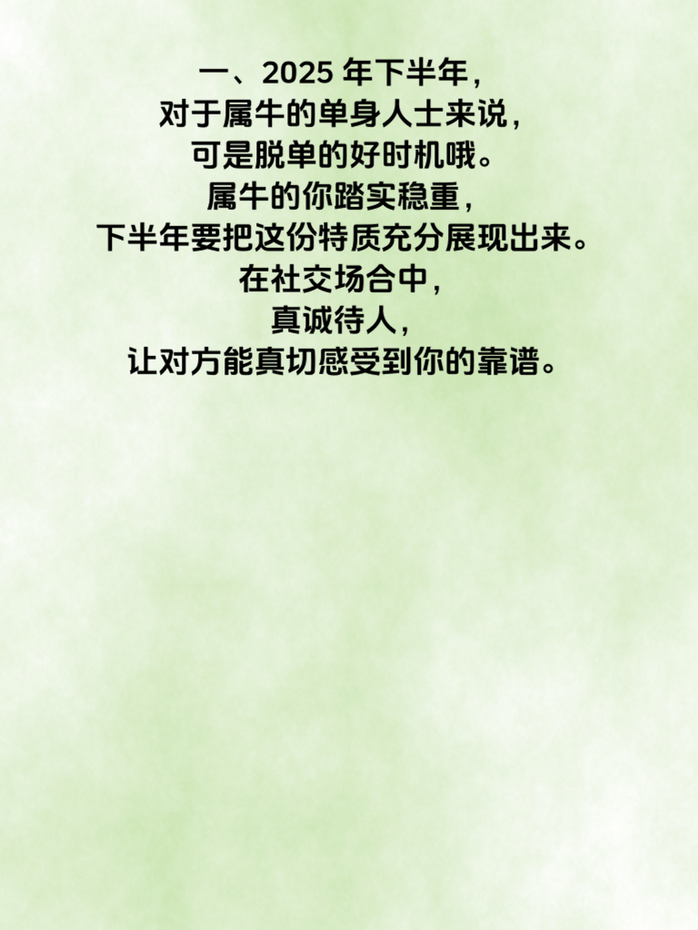 一、2025 年下半年对于属牛的单身人士来说,可是脱单的好时机哦。属牛的你踏实稳重,下半年要把这份特质充分展现出来。在社交场合中,真诚待人,让对方能真切感受到你的靠谱。 二、主动拓展社交圈子是关键。不要局限于现有的生活范围,参加一些兴趣小组、行业活动等。比如喜欢阅读,就去参加读书俱乐部,在那里更容易遇到志同道合且有缘分的那个她。 三、注重自身形象管理。不需要过度奢华,但要整洁得体。合适的着装能提升你的自信,也会给他人留下良好的第一印象。 四、聊天时要学会倾听。当女生说话时,认真聆听她的想法和感受,适时给予回应和理解。用你的耐心和真诚打开她的心扉,让她愿意和你深入交流。 五、制造一些小惊喜。不需要很昂贵,一份亲手做的小点心,或者一张写满心里话的卡片,都能让她感受到你的用心,增进彼此之间的感情。