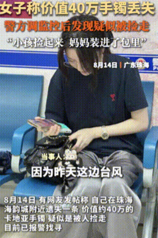 “这下麻烦了!”广东珠海,一女子游玩期间,不慎把价值40万的手镯丢失!女子赶紧报警处理,可当警察查看监控时,却发现手镯被一个孩子捡走,而孩子妈妈看到后,二话不说就装进了包里!目前警方正在找寻,而律师的一番话让人感到震惊!网友:我捡了估计也以为是假的! “这可是整整40万,如果要不回来我可怎么过啊!”女子激动地说道,珠海海韵城门口,一场价值40万元的卡地亚满天星手镯遗失事件,正随着监控录像的曝光而掀起风暴。 8月广东珠海遭遇强对流天气,一名女子在门口等候车辆时,突如其来的强风将雨伞吹翻,伞骨重重磕碰其手腕,导致佩戴的卡地亚手镯瞬间脱落,这款手镯市场估值近40万元,是女子珍藏多年的贵重物品,直到抵达目的地后她才发现手腕空空如也,立即冒雨返回现场搜寻无果,最终报警求助。 警方调取的监控录像显示,手镯脱落后滚落在地,约两分钟后被一名路过的孩童捡起,孩子随即跑向身旁的母亲,将闪亮的饰品递到她面前,令人意外的是这位母亲在短暂观察后,迅速将手镯塞进自己的包内,拉着孩子快步离开现场。 女子通过监控认出这一幕后情绪崩溃:“她明明看到是我们掉落的,为什么直接拿走?”目前警方已介入调查,但涉事母子尚未找到,针对此事律师分析指出,拾得遗失物应当返还权利人,拒不归还可能构成侵占罪。 事件曝光后瞬间在网上引起热议,一位网友留言道:“暴雨天戴这么贵的手镯确实冒险,但拾金不昧是基本底线。” 另一位网友则表示:“现在监控这么清晰,建议直接发寻人启事,法律不会放过占小便宜的人。” 目前失主仍在焦急等待警方消息,而这场“40万手镯考验人性”的风波,已然成为社会道德与法律认知的鲜活样本。 对此你怎么看?欢迎大家在评论区留言讨论。