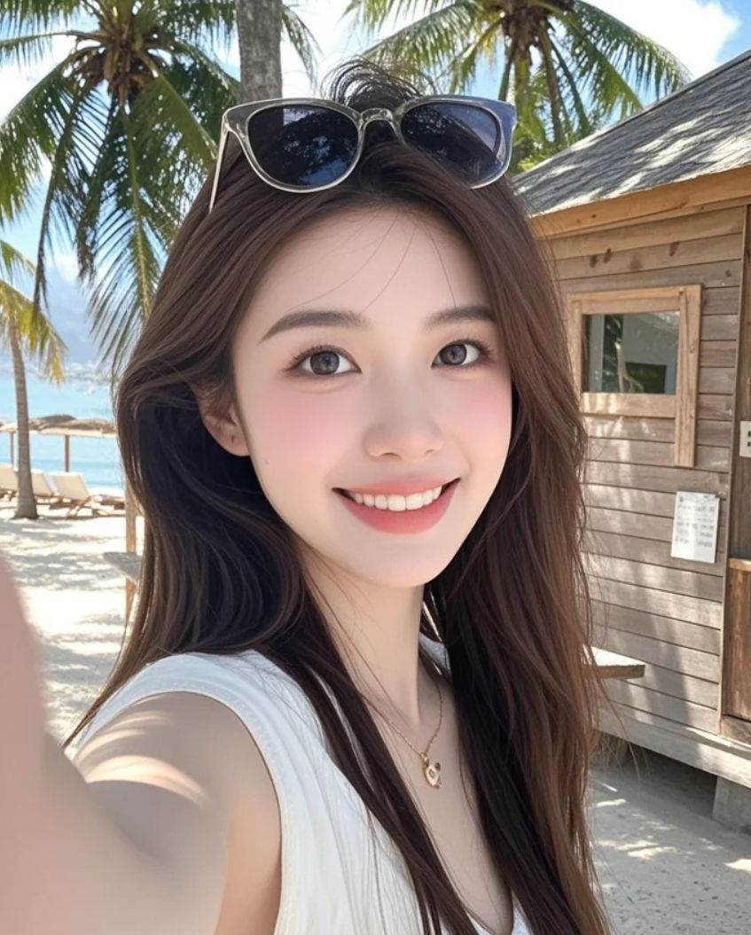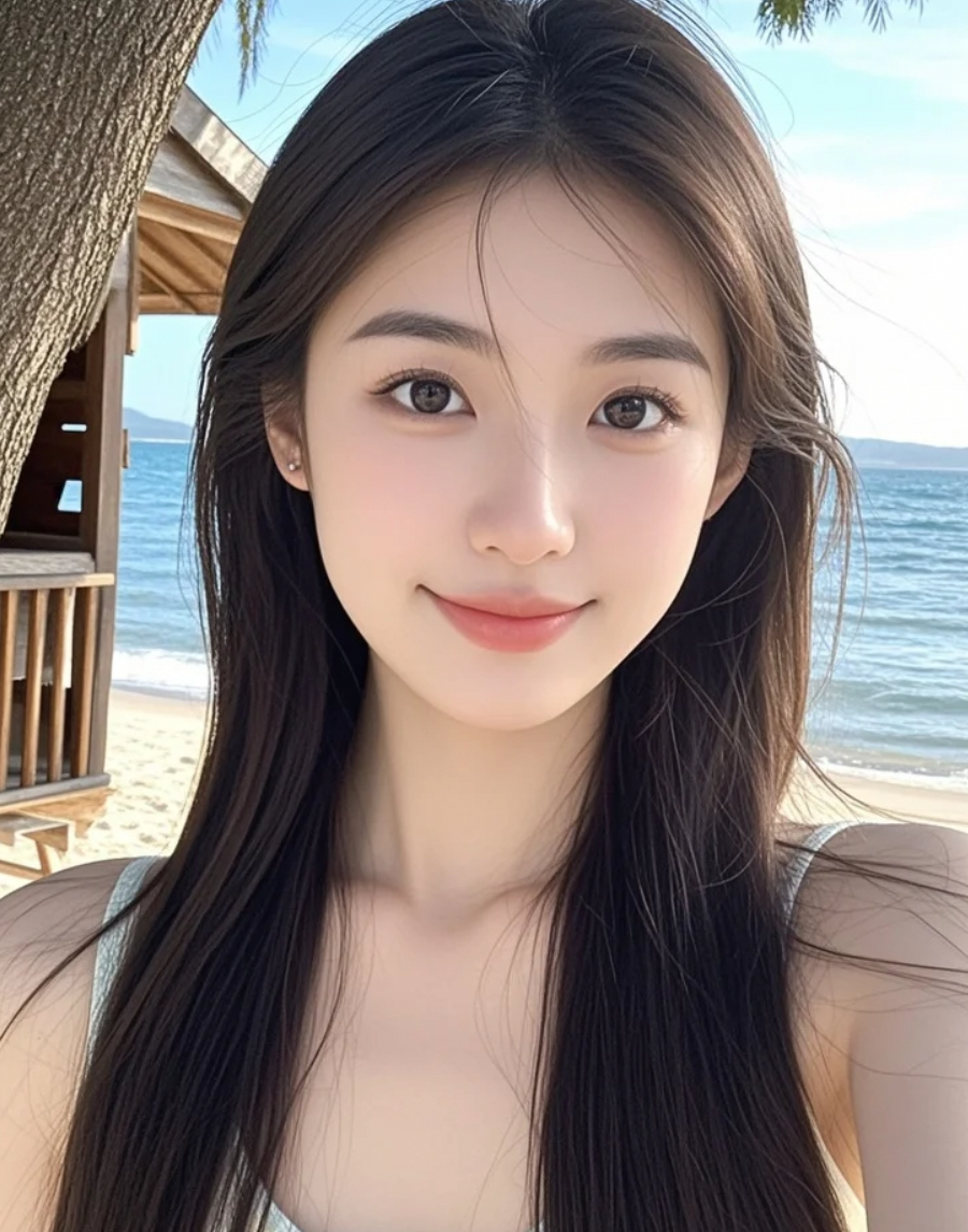 沙滩长发女孩,晚风轻抚,笑容温柔而充满神秘