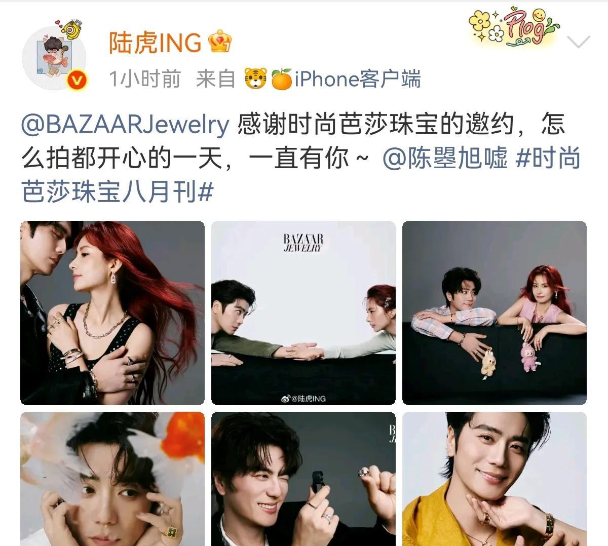 陆虎嘘嘘受时尚芭莎珠宝邀约拍八月刊,俩人又是带薪约会的一天[星星眼] 陆虎:怎么拍都开心的一天,一直有你… 真夫妻就是好磕