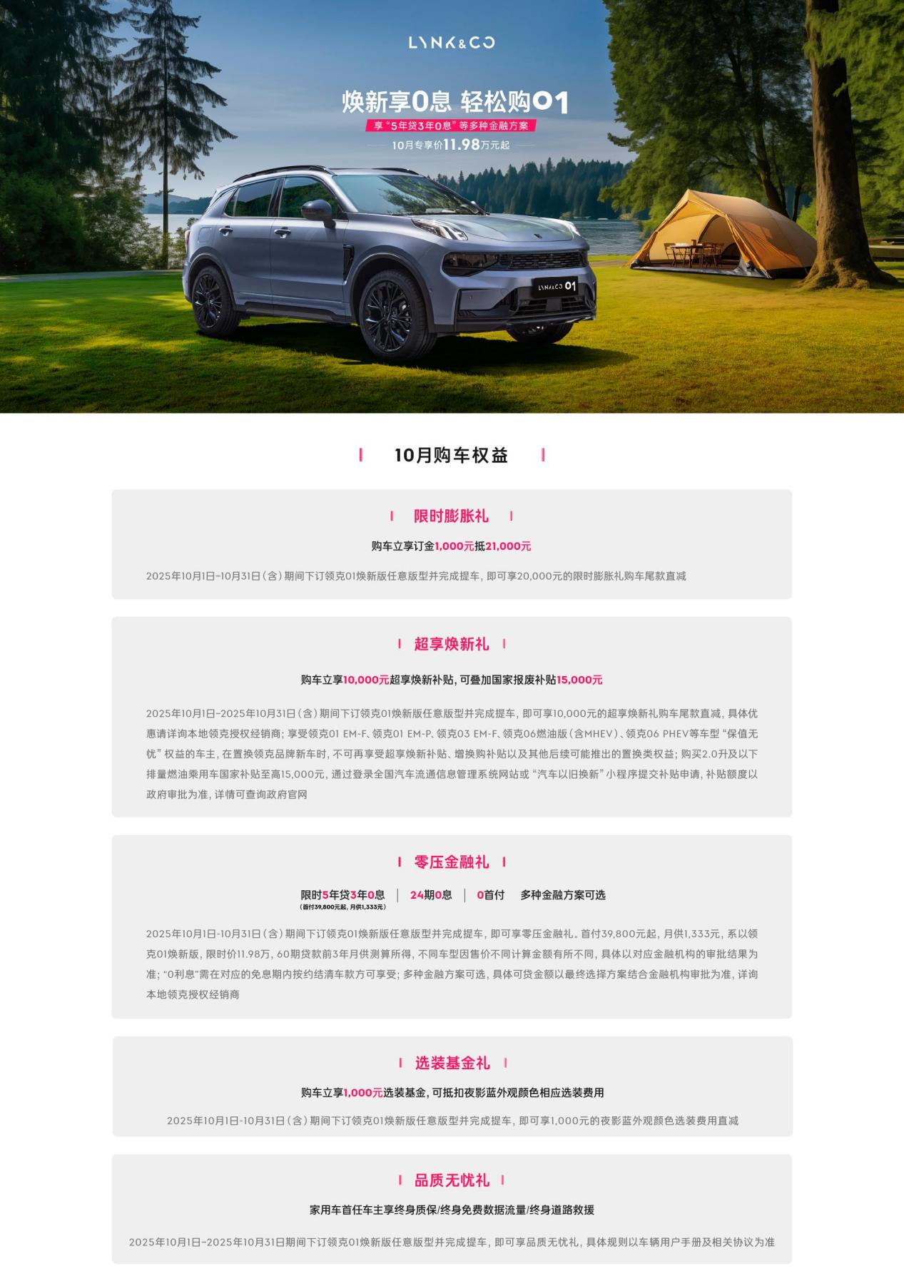 除了产品本身的卓越性能外,领克01焕新版在十月份还推出了多项限时优惠政策。车型起步价直接降至11.98万元,配合订金1000元抵21000元以及10000元的焕新补贴政策,使得实际购车门槛得到了大幅降低。对于预算有限的消费者来说,5年贷款3年0息的金融方案无疑是一个巨大的福音,首付仅需3.98万元起即可将车开回家。此外,购车还可享受1000元的选装基金,正好可用于个性化的夜影蓝车色选装。更为贴心的是,首任车主还可享有终身质保、终身免费流量以及道路救援服务,彻底解决了用车的后顾之忧。