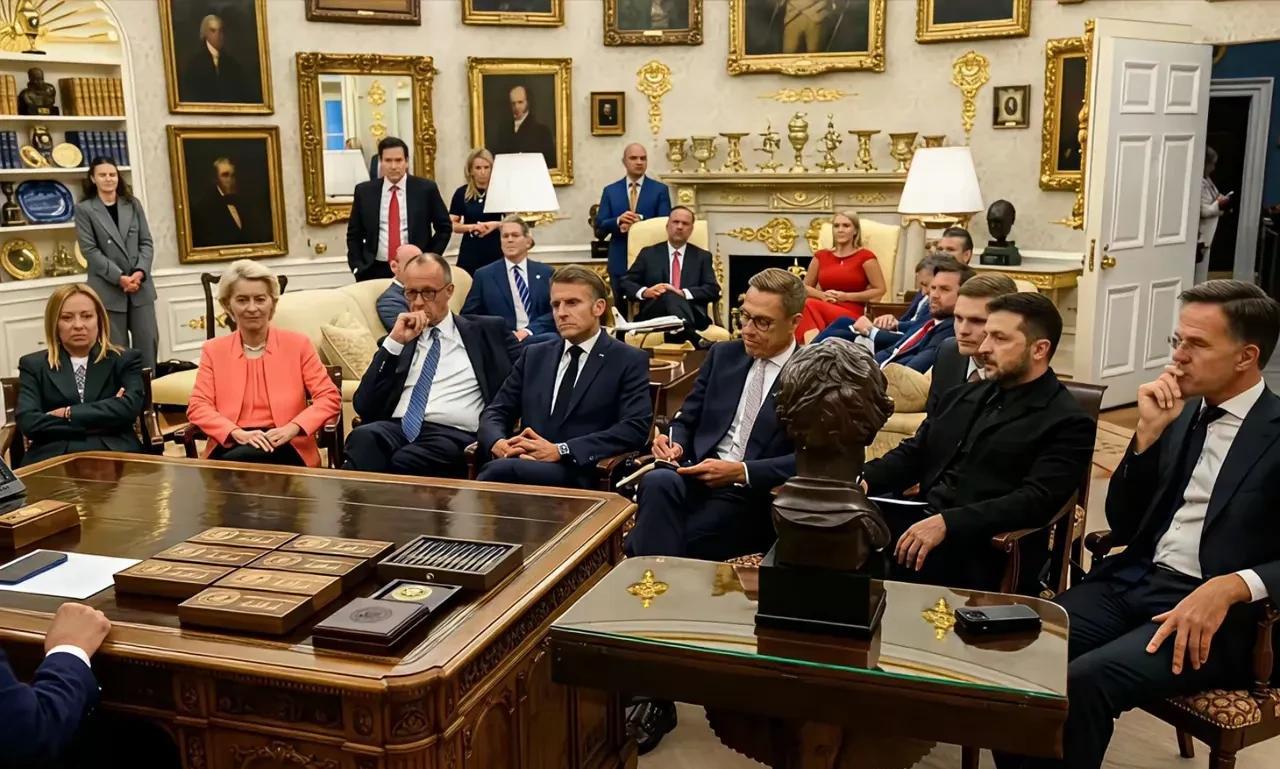 历史性一天的椭圆形办公室场景! 老特:这种出风头的感觉实在太上头了! 怎么说也得把会客厅布置得像样点吧!就这种会议场景,人员都不作个介绍,不知道的,还以为是特朗普在给他的下属们开会呢。欧洲人耻辱的一天,老特对待普京,都比对待这群人好,真不知道欧洲这群蠢人怎么想的,天堂走路不走,地狱无门闯进去。