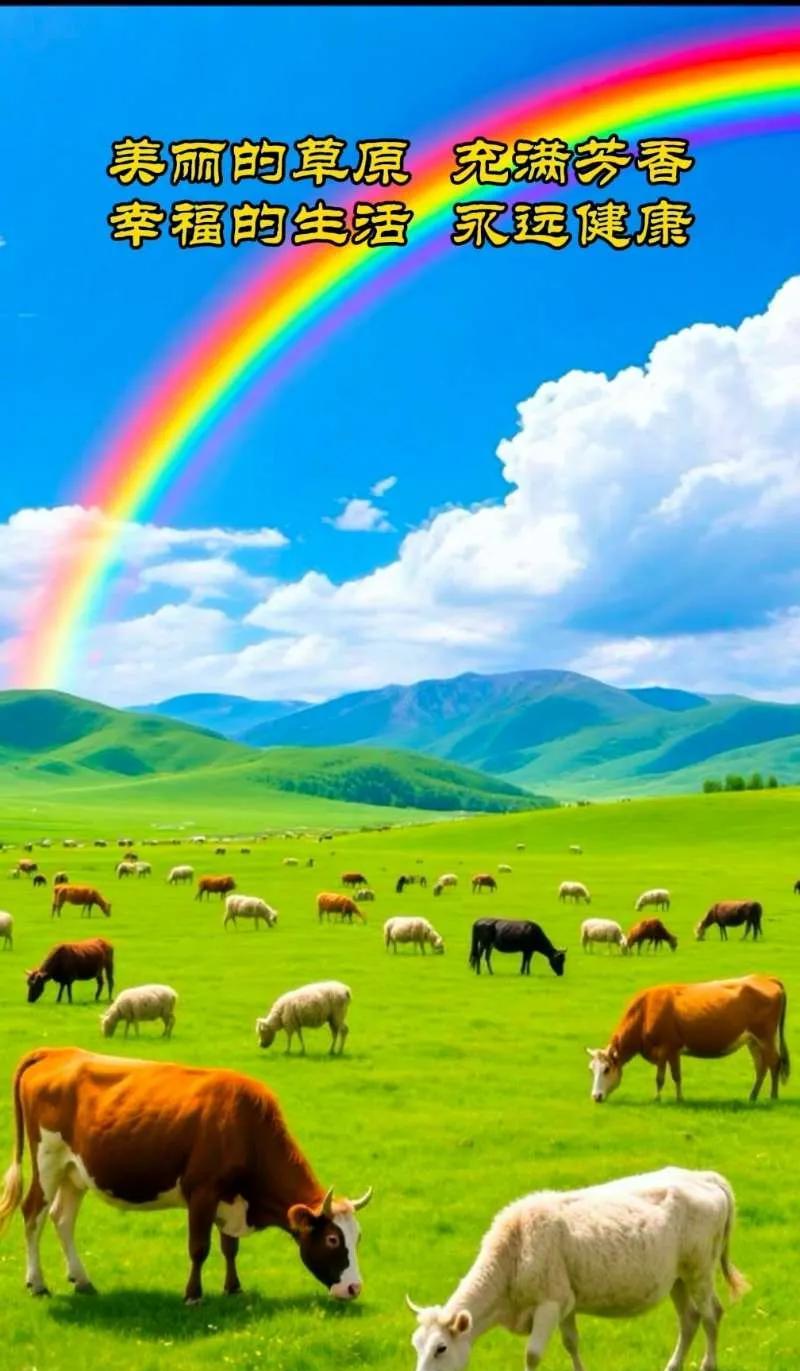 【草原牧歌】 在广袤无垠天地间, 美丽草原似绿毡蔓延。 牛羊若云朵,满坡轻绽, 骏马如疾风,自由驰旋。 阳光倾洒,温柔且灿, 勾勒和美画卷。 它们于此,悠然繁衍, 其乐融融,岁月眷恋。 风携草香,悄然流转, 诉说幸福长愿。 这片草原,梦之栖畔, 宁静祥和,永驻心田。